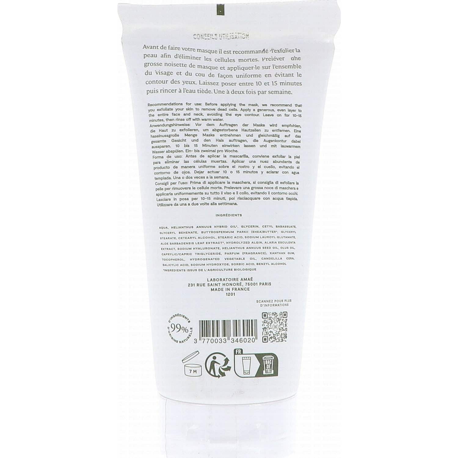 La formulación de la mascarilla incluye ingredientes como agua, aceite de girasol, glicerina y extractos naturales, asegurando así un enfoque en la hidratación y el cuidado de la piel.