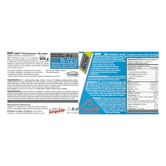 AMIX™ Performance Re-Cuper es un complemento alimenticio concentrado diseñado para ser consumido tras la actividad física. A base de aislado de proteína de suero de leche CFM® e hidrolizado de proteína de suero de leche con alto contenido en L-Glutamina y BCAA (instantáneos). Re-Cuper tambien contiene Citrulina, Beta-Alanina, Glicina, vitaminas y minerales.