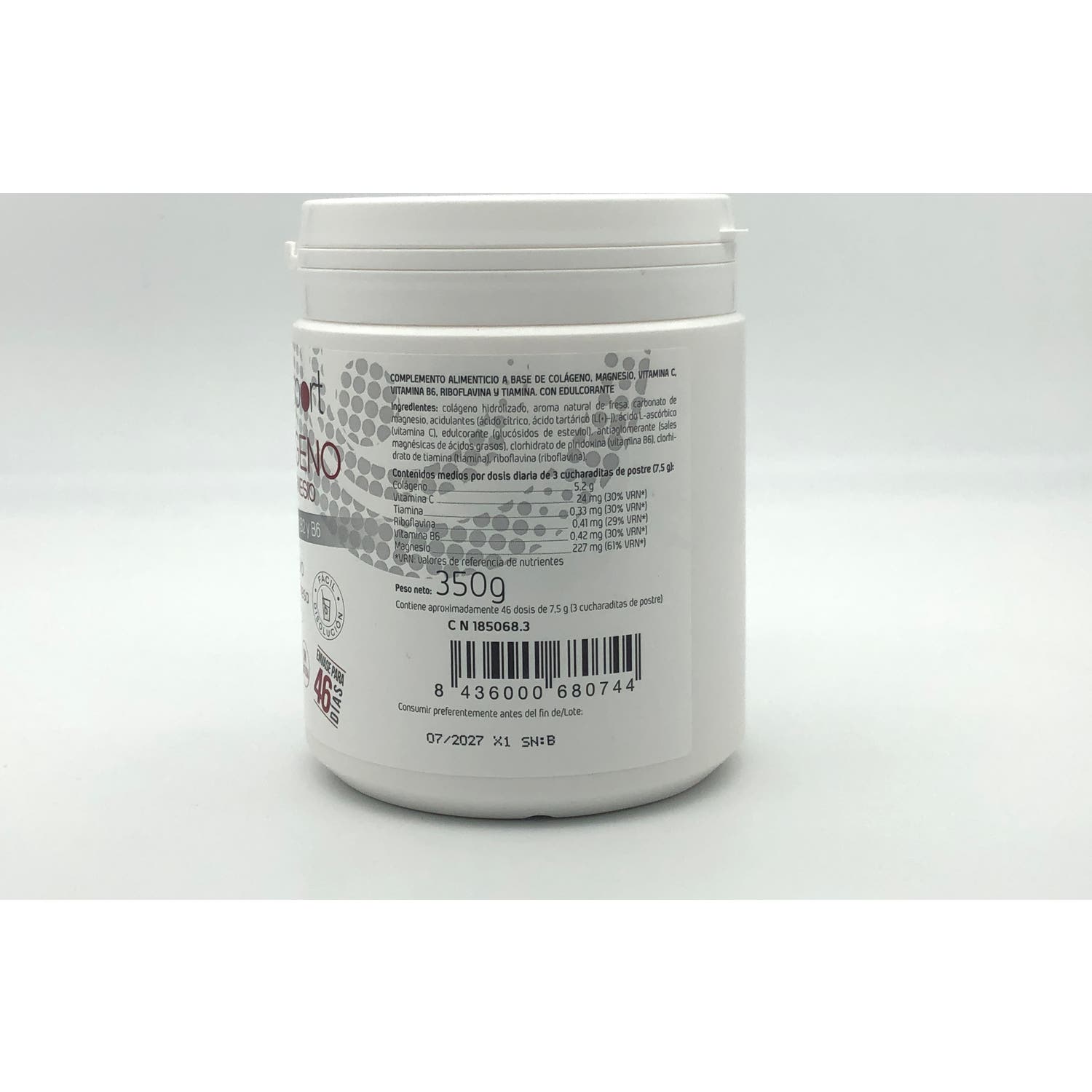 Magnesio (240 mg), Vitamina C (24 mg), Colágeno (5.2 g), Vitamina B6 (0.42 mg), Riboflavina (0.42 mg), Tiamina (0.33 mg).
