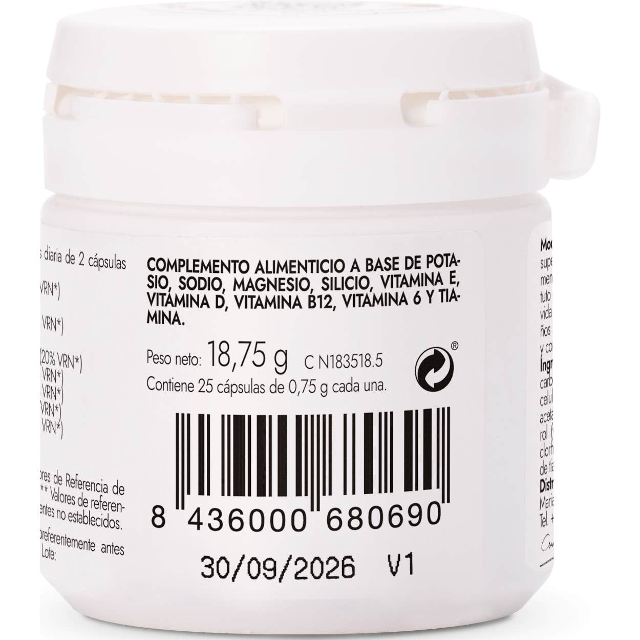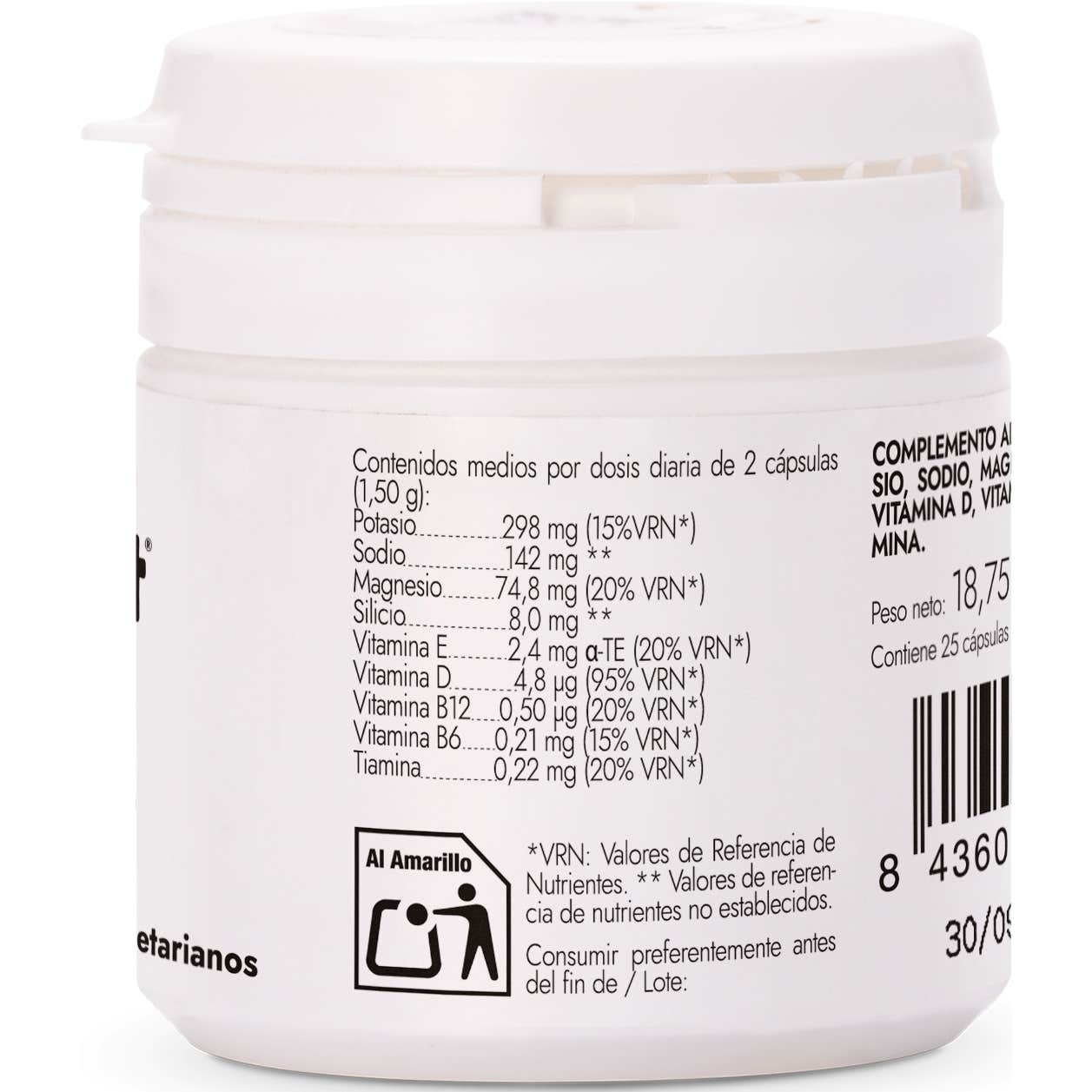 Por dosis diaria de 2 cápsulas (1,50 g): potasio 298 mg (15% VRN), sodio 142 mg, magnesio 74,8 mg (20% VRN), silicio 8,0 mg, vitamina E 2,4 mg α-TE (20% VRN), vitamina D 4,8 μg (95% VRN), vitamina B12 0,50 μg (20% VRN), vitamina B6 0,21 mg (15% VRN), tiamina 0,22 mg (20% VRN). Ingredientes: cloruro de potasio, cloruro de sodio, carbonato de magnesio, cápsula (hidroxipropilmetilcelulosa), antiaglomerantes (talco, dióxido de silicio), acetato de DL-alfa-tocoferilo (vitamina E), colecalciferol (vitamina D), cianocobalamina (vitamina B12), clorhidrato de piridoxina (vitamina B6), clorhidrato de tiamina (vitamina B1).