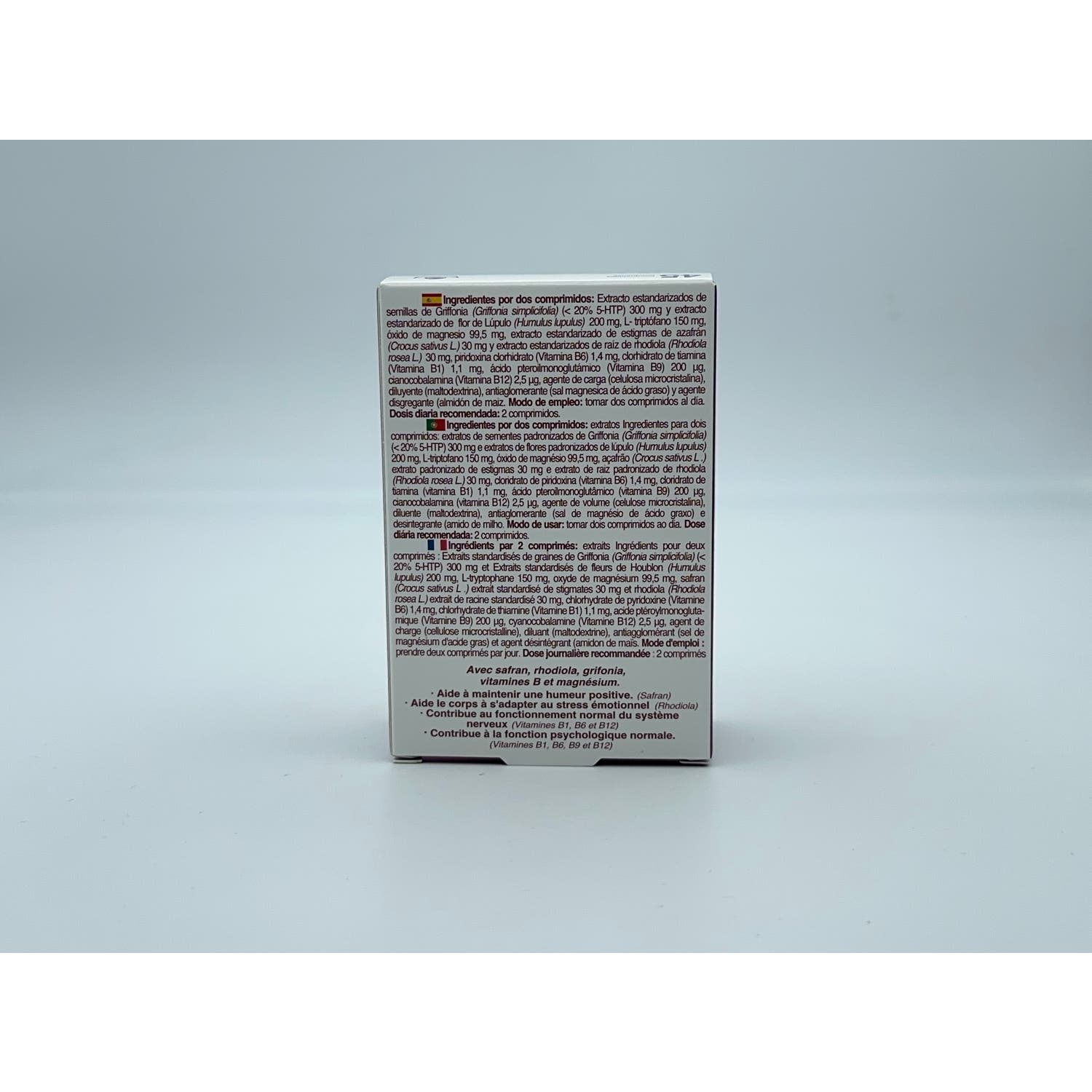 Por 2 comprimidos: Extractos estandarizados de grifonia (300 mg), Lúpulo (200 mg), Ácido pteroilmonoglutámico (200 µg), L-Triptófano (150 mg), Óxido de Magnesio (30 mg), Rhodiola (30 mg), Cianocobalamina (2.5 µg), Piridoxina clorhidrato (1.4 mg), Clorhidrato de tiamina (1.1 mg), Dióxido de Silicio, Estearato de magnesio, Celulosa microcristalina, Azafrán.