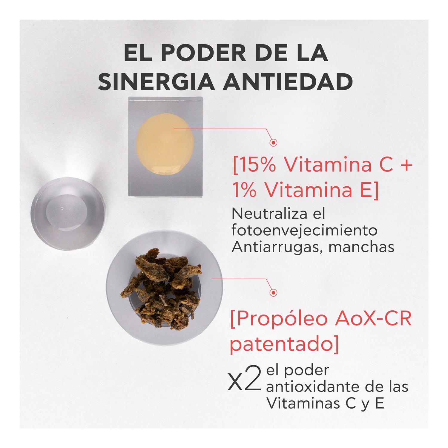 Su incomparable eficacia se ha demostrado frente al doble poder antioxidante de la Vitamina C + E, reforzando los resultados antiedad de esta combinación sinérgica.Su textura ligera y su rápida absorción aseguran un acabado luminoso, suave y no graso en la piel.