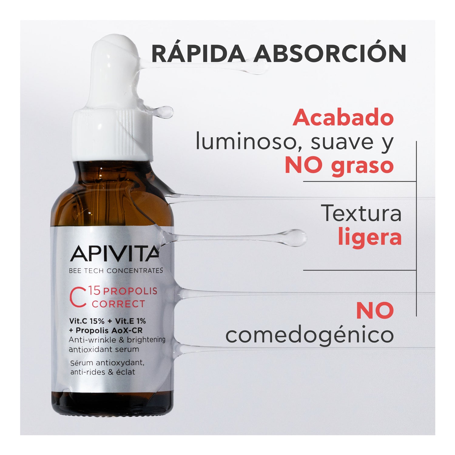 Sérum Corrector C15 Propóleo revela el poder de la sinergia antiedad de la Vitamina C, la Vitamina E y el Propóleo Aox-CR patentado.Ofrece una protección oxidativa gracias al 15% de Vitamina C pura estabilizada y 1% de Vitamina E.La potente eficacia de estos dos activos dermatológicos más reconocidos se ve reforzada por el exclusivo Propóleo AoX-CR patentado de APIVITA.