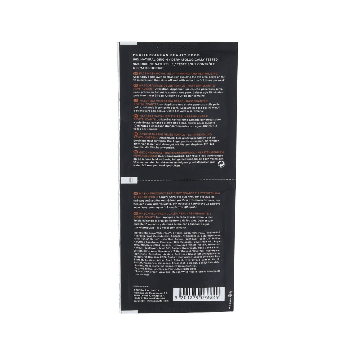 Mascarilla facial de hidratación que favorece la nutrición y firmeza de la piel. Formulada a base de miel de tomillo, aceite de oliva, manteca de karité, ácido hialurónico y proteínas de trigo, que ayudan a mantener los niveles óptimos de hidratación de la piel. Contiene infusión de té de montaña griego, 100% orgánico, con acción antioxidante y extracto de ziziphus, que aporta un efecto tensor. Con jalea real encapsulada en liposomas, que contribuyen a reafirmar los contornos del rostro. Dermatológicamente probada. Sin aceite mineral, parabenos ni siliconas. Adecuada para todo tipo de piel, incluso las sensibles.