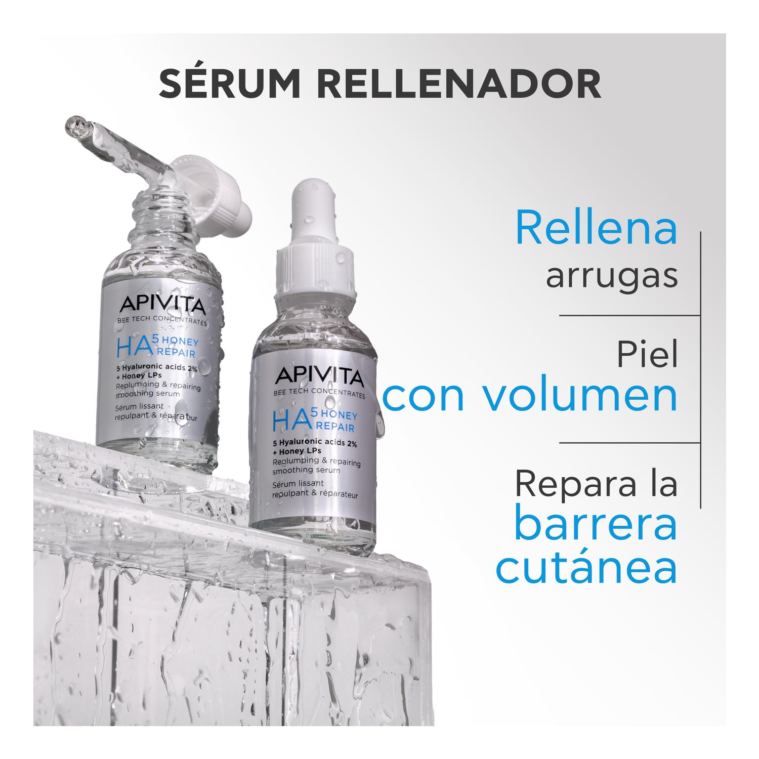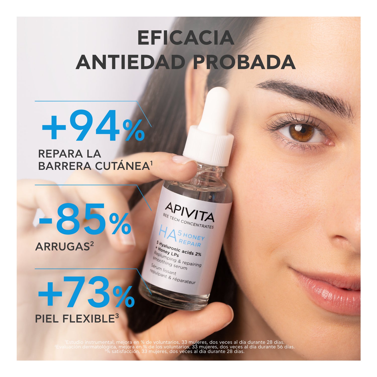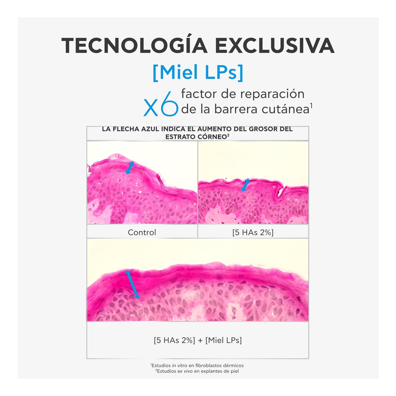 El Sérum Reparador HA5 Miel potencia el poder de la sinergia rellenadora del ácido hialurónico y la miel para reducir visiblemente las arrugas y alisar la piel.Este contiene el más amplio espectro existente de 5 pesos moleculares de ácido hialurónico al 2% que recupera la hidratación en todas las capas de la piel. Potenciado aún más por la Tecnología Miel LPs, una encapsulación liposomal que asegura una óptima penetración en la piel de las moléculas bioactivas recuperadoras de la miel.