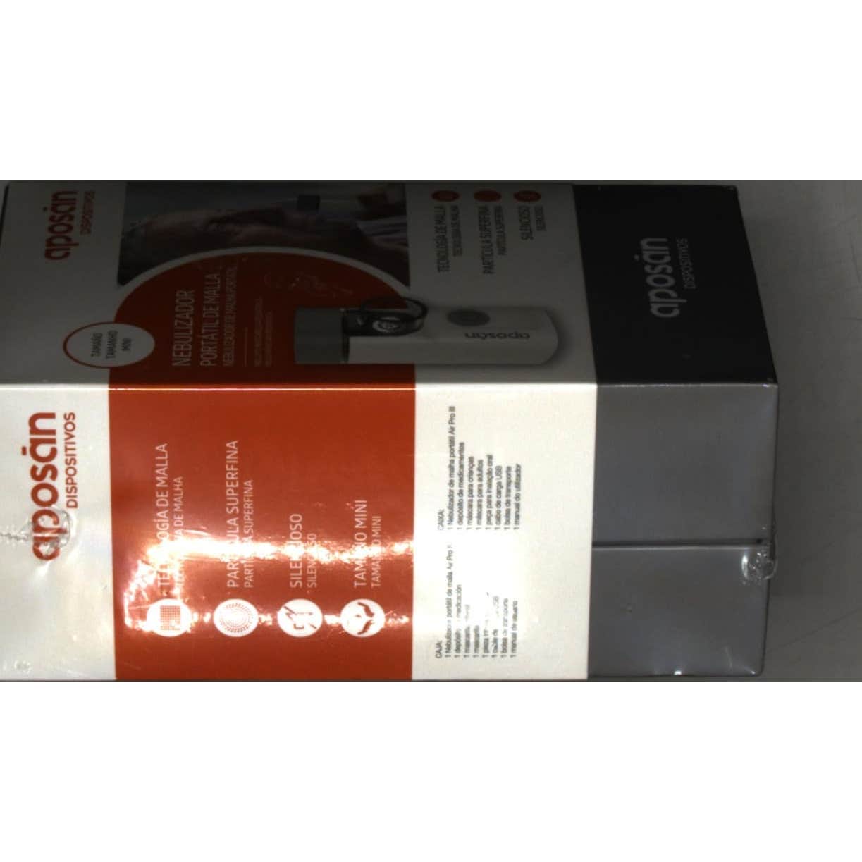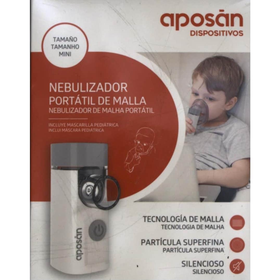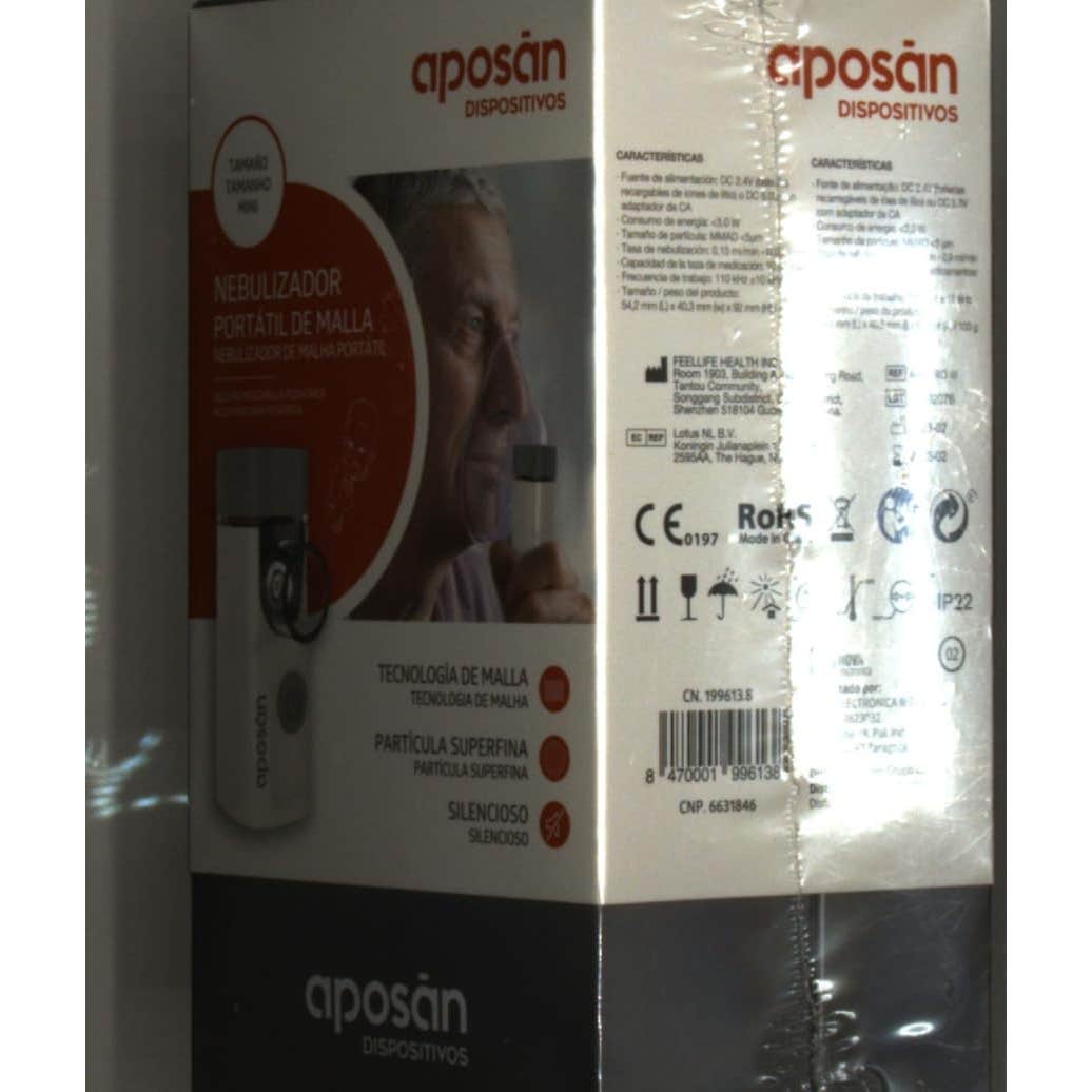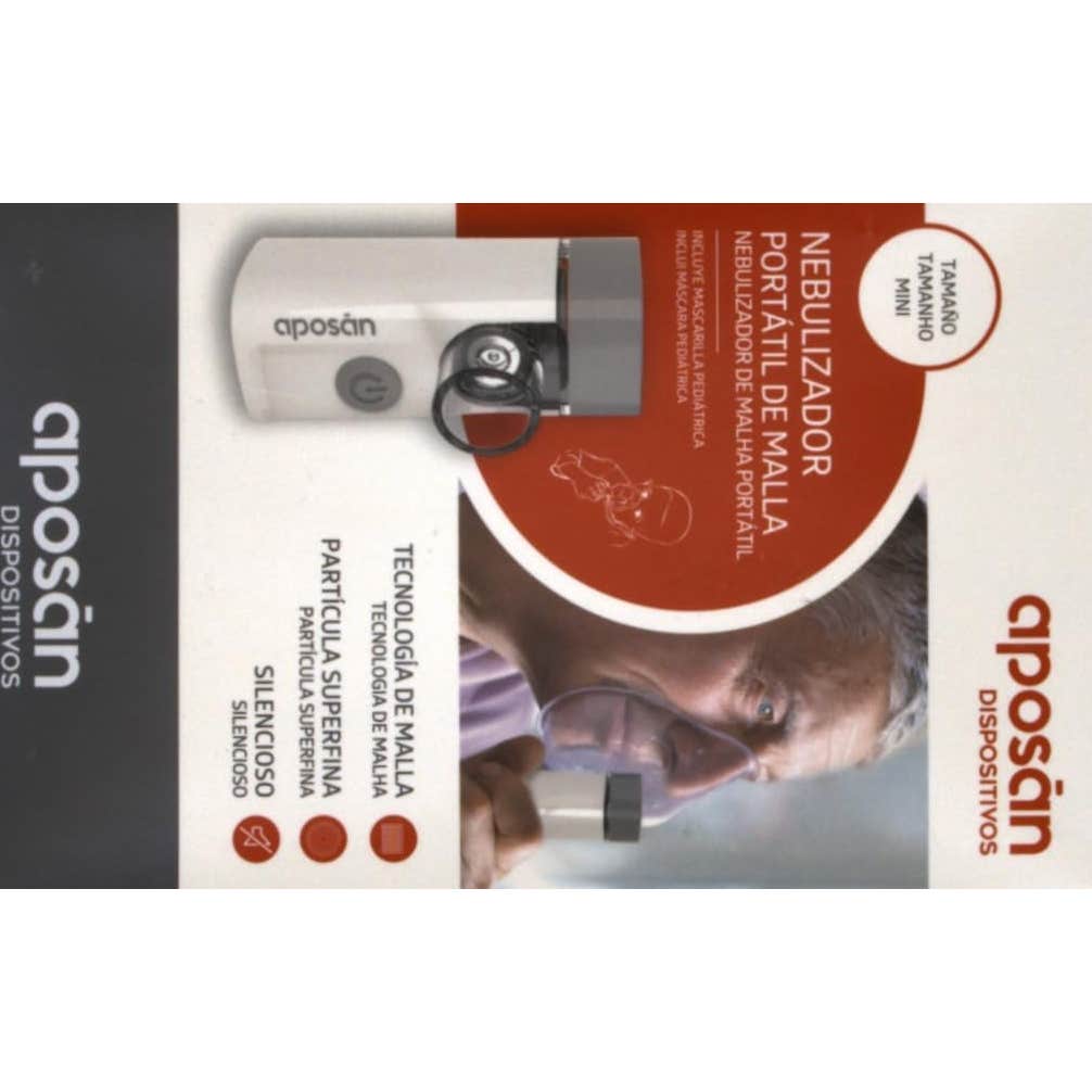 Dispositivo portátil nebulizador de malla muy silencioso con depósito para la medicación, que incluye una mascarilla pediátrica elaborada con una partícula muy fina. Funciona con baterías de Litio-ion recargables o mediante un cable de carga tipo USB. Tiene una duración de batería aproximado de 1 hora en contínuo, y tarda 1,5 horas en completarse la carga.