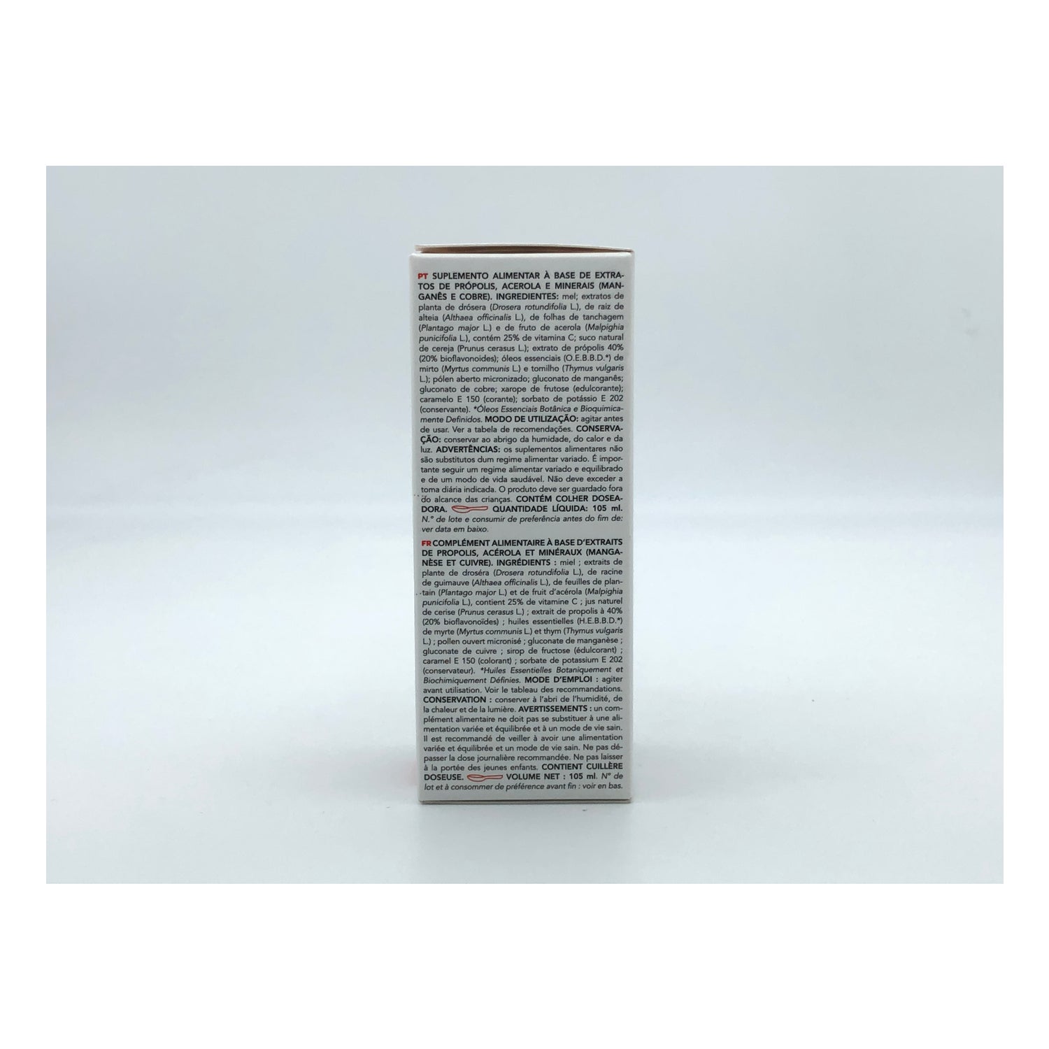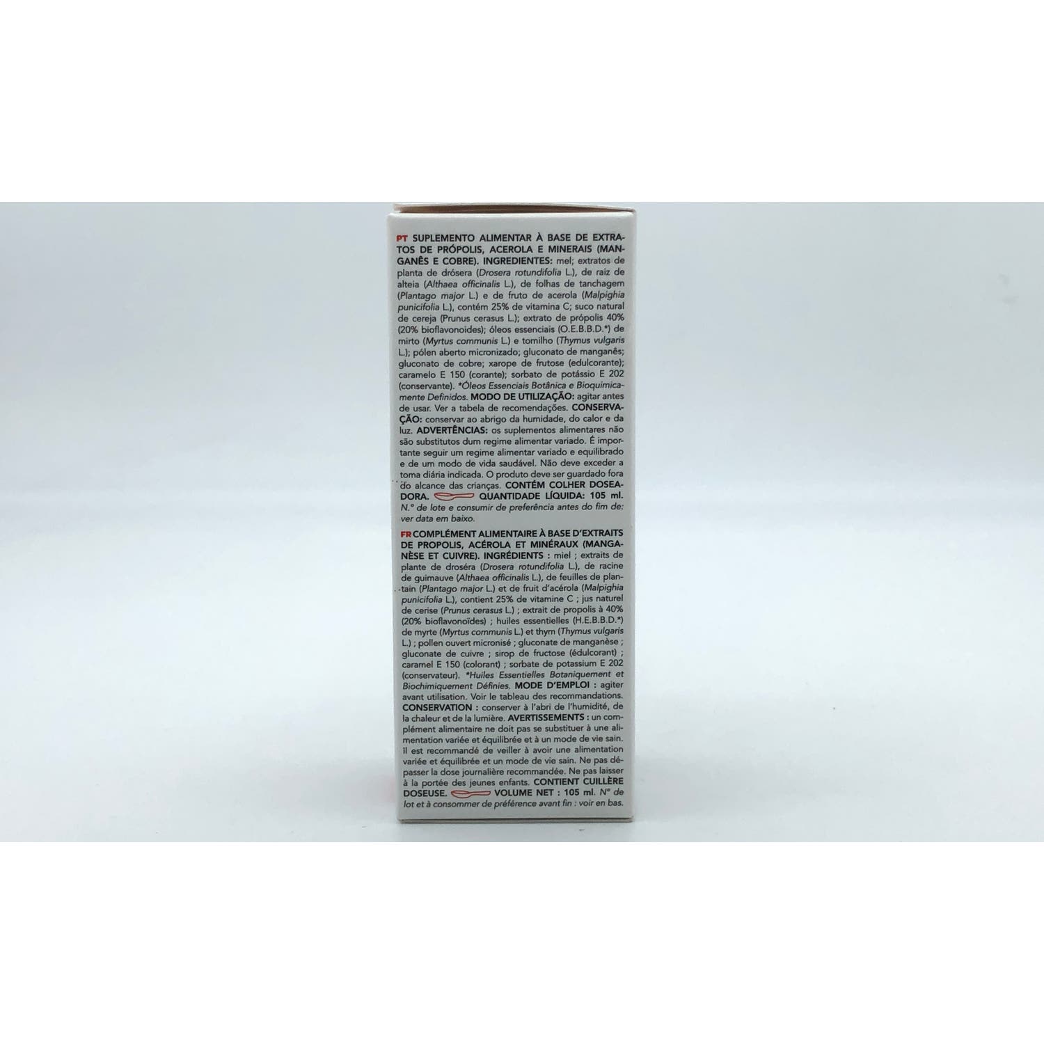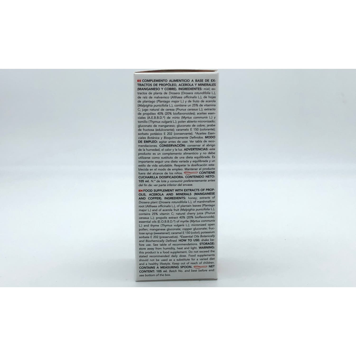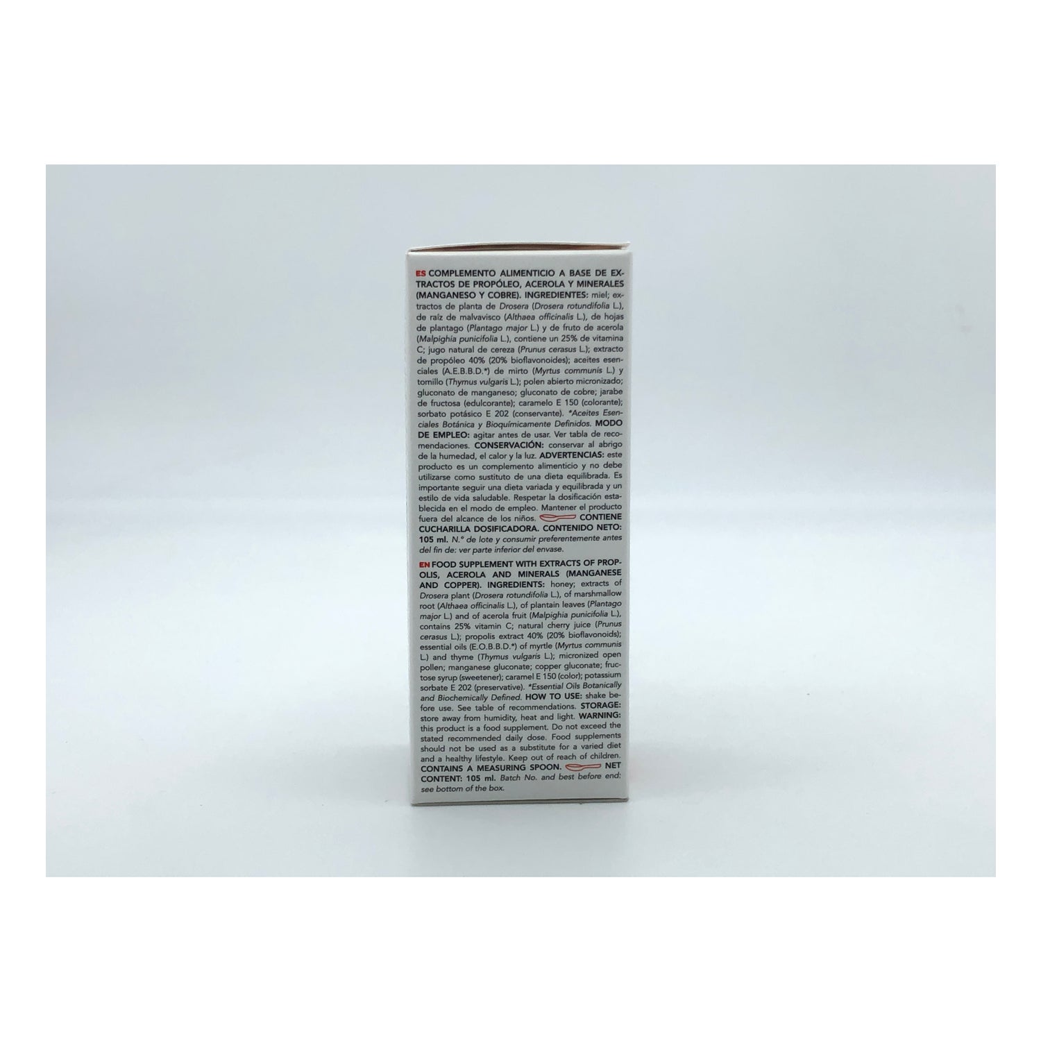 Complemento alimenticio que contribuye al funcionamiento normal del sistema inmunitario y calma la tos gracias al extracto de drosera. Está compuesto de: