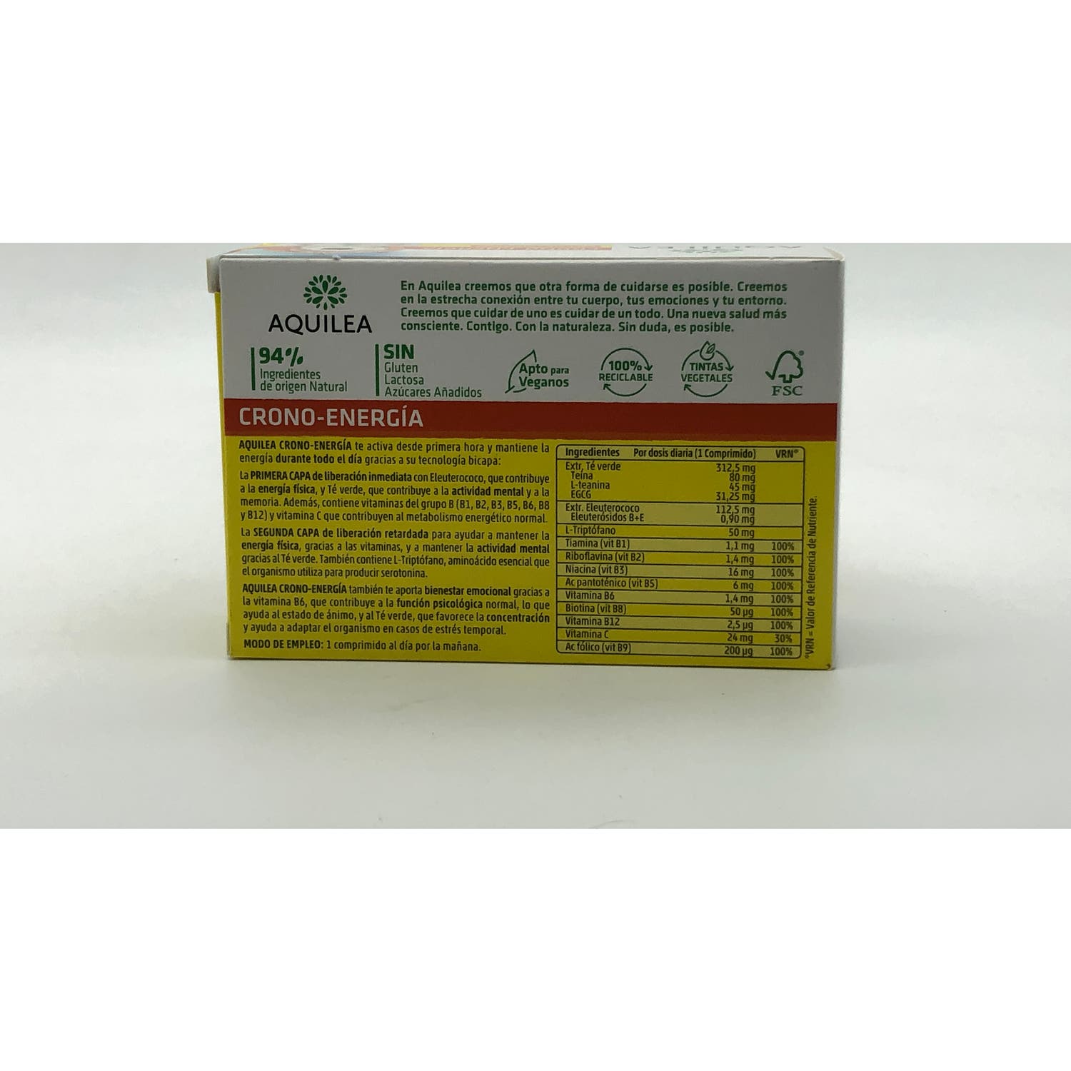 Elaborado con extractos naturales y con vitaminas del grupo B (B1, B2, B3, B5, B6, B8, B9, B12) y C, que contribuye a aumentar la energía física necesaria para realizar las actividades diarias. Sus comprimidos poseen tecnología bicapa: La primera se libera de forma inmediata y la segunda, se libera poco a poco para mantener la energía todo el día.
