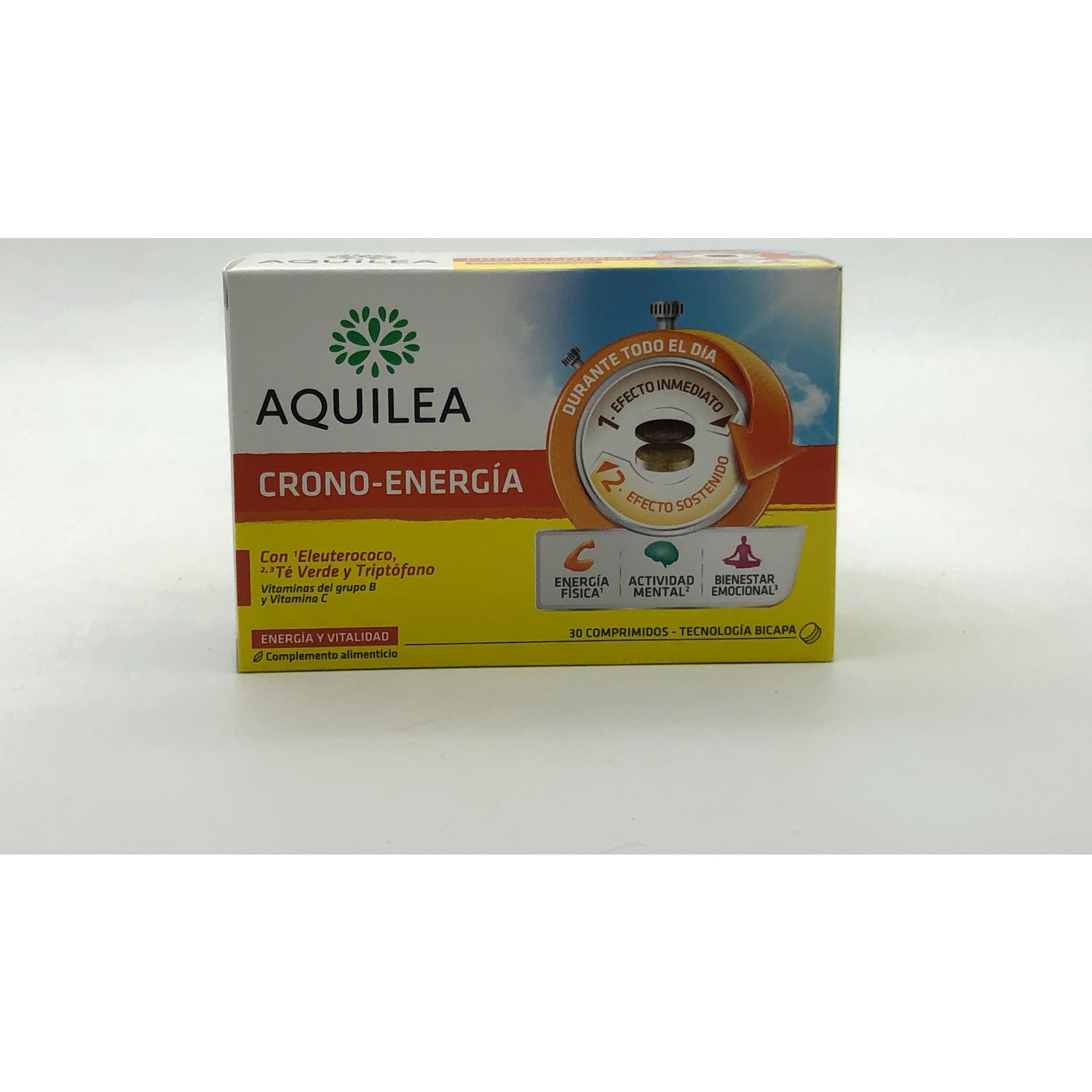 Aquilea Crono-Energía 30Comp es un complemento alimenticio que ayuda a mantener la energía durante todo el día por el diseño de sus comprimidos con bicapa.