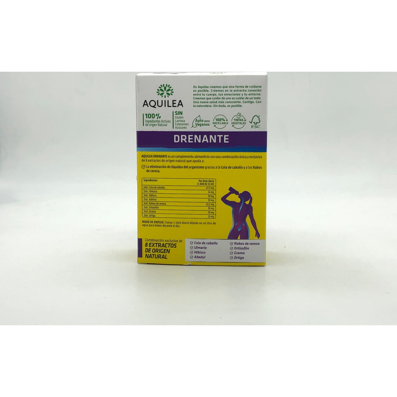 Aquilea Drenante 15 sticks es un complemento alimenticio que contribuye a tratar y reducir la retención de líquidos, además de causar hinchazón de piernas y tobillos o aumento paulatino del peso o fatiga.