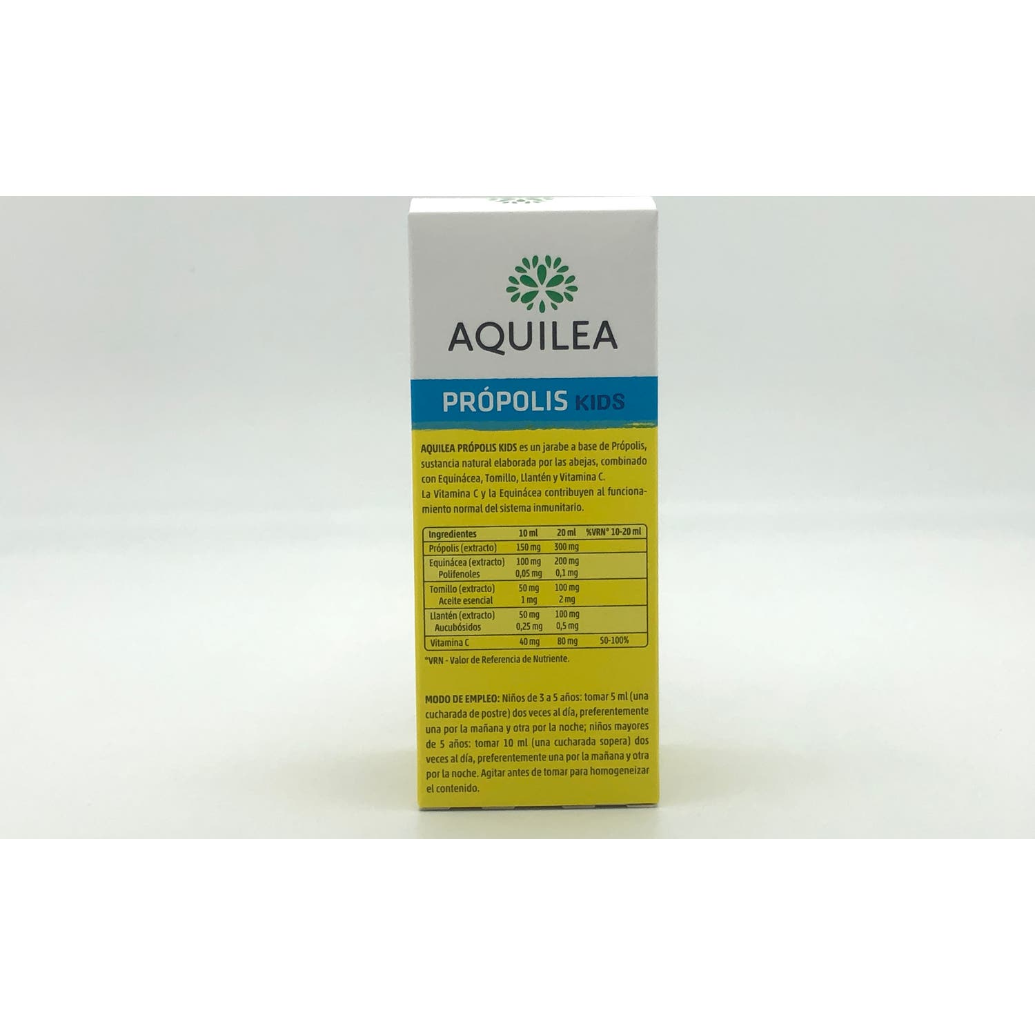Niños de 3 a 5 años: Tomar 5 ml de aquilea kids própolis (1 cucharada de postre), dos veces al día. Una en el desayuno y una en la cena.