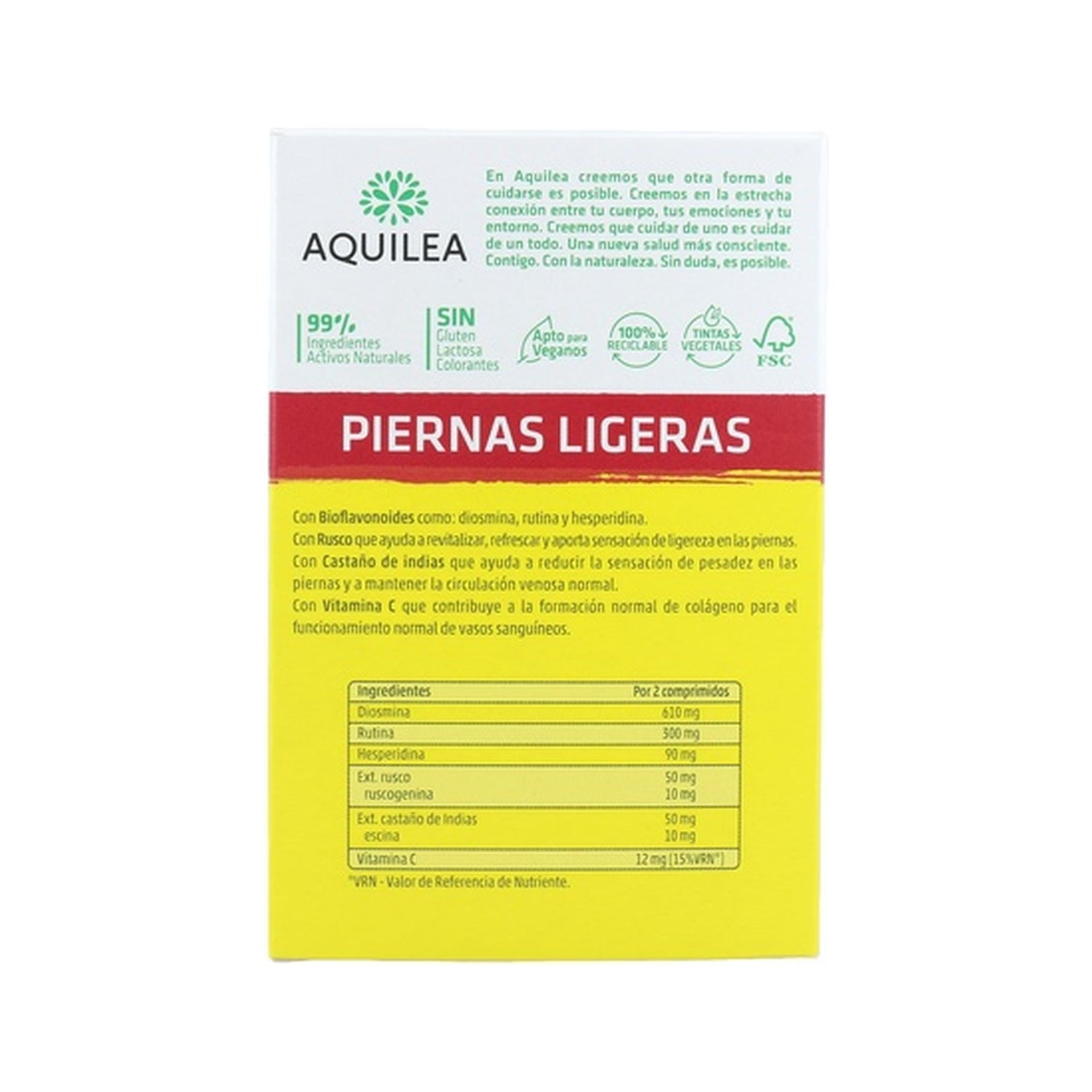 Aquilea Piernas Ligeras 2x60comp es un complemento alimenticio que ayuda a reducir la sensación de piernas cansadas, además de mantener la circulación venosa normal y aliviar la mala circulación.