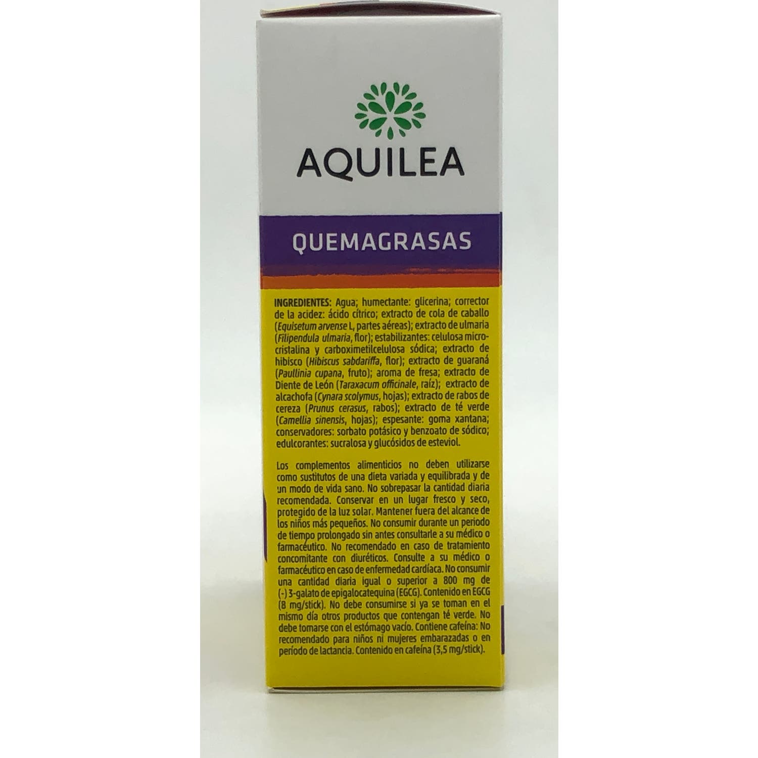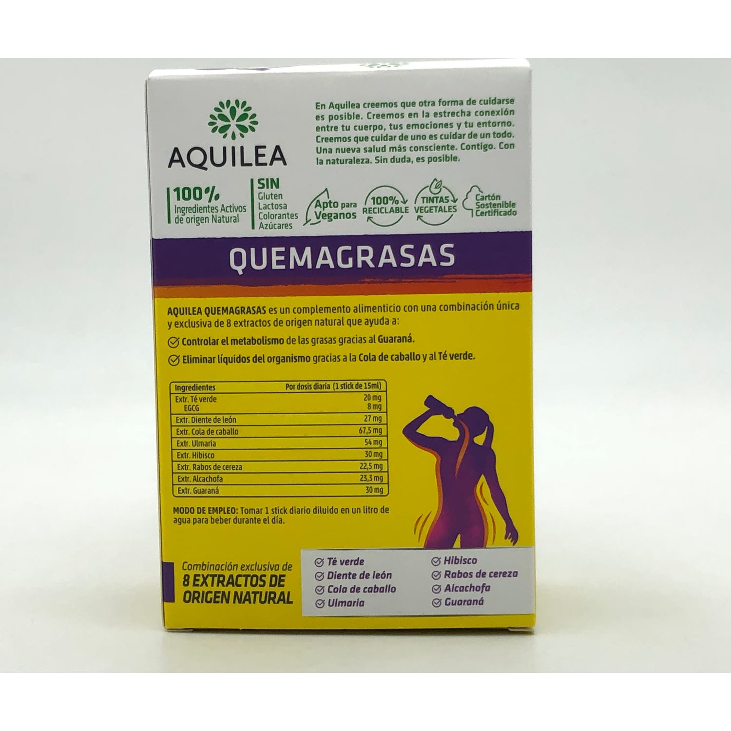 Aquilea Quemagrasas 15 sticks es un complemento alimenticio en forma de stick soluble que ayuda a eliminar líquidos y da soporte en la quema de grasas.