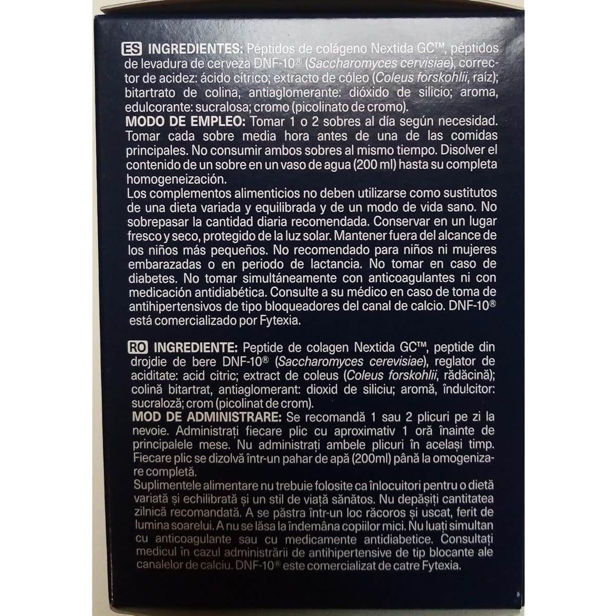 Péptidos de colágeno Nextida GCTM, péptidos de levadura de cerveza DNF-10® (Saccharomyces cervisiae), corrector de acidez: ácido cítrico; extracto de cóleo (Coleus forskohlii, raíz); bitartrato de colina, antiaglomerante: dióxido de silicio; aroma, edulcorante: sucralosa; cromo (picolinato de cromo).