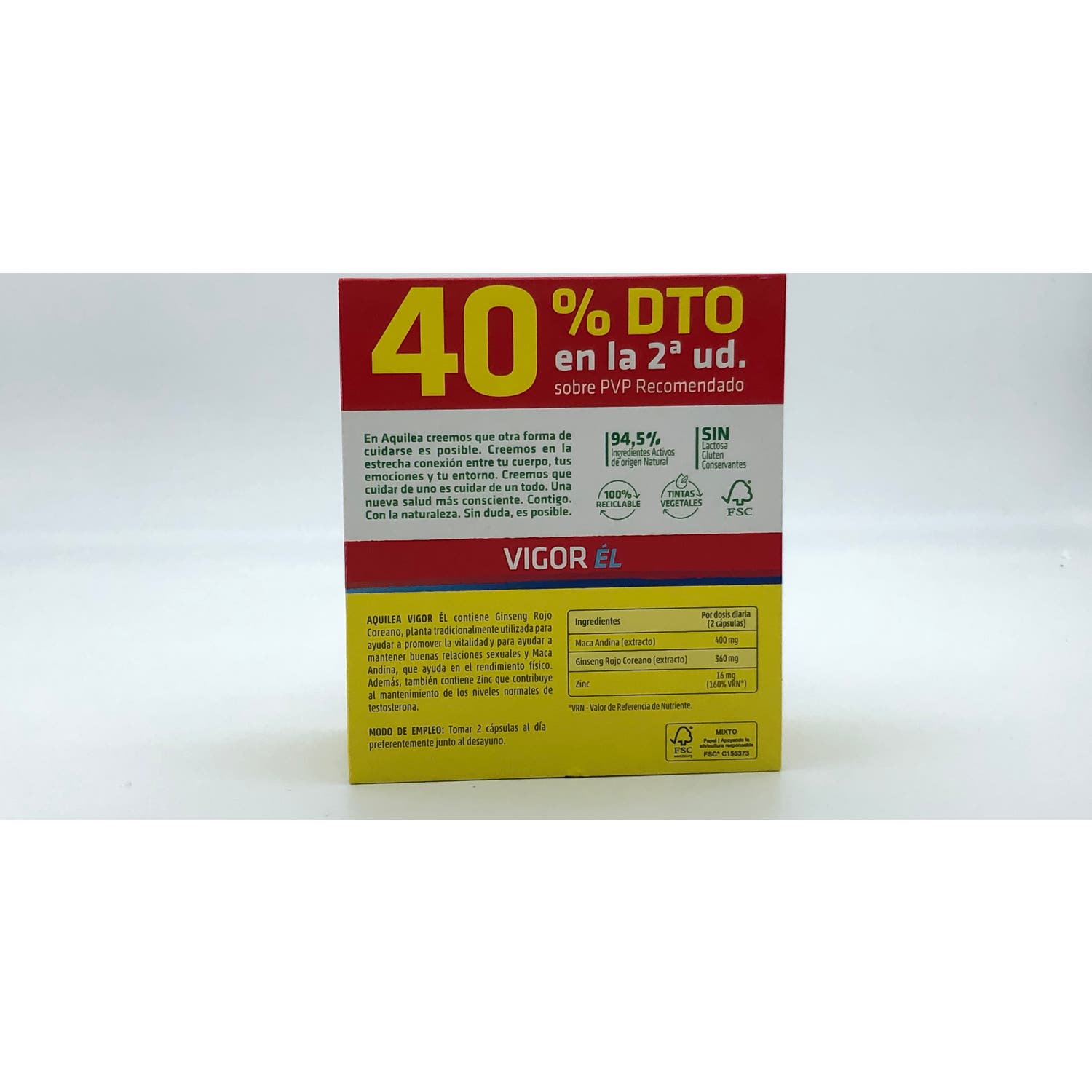 Aquilea Vigor Él contiene Ginseng Rojo Coreano que ayuda a mantener el vigor físico y mental. Además contiene Maca andina, utilizada de forma tradicional para mejorar la vitalidad de las relaciones y Zinc que contribuye al mantenimiento de los niveles de testosterona.