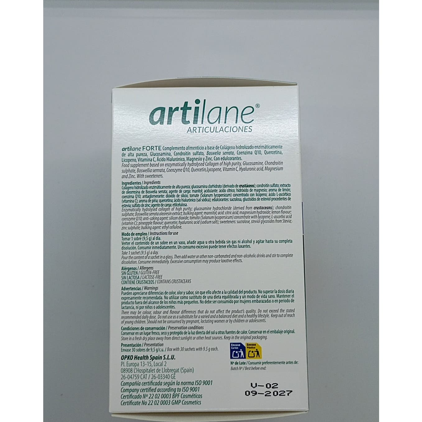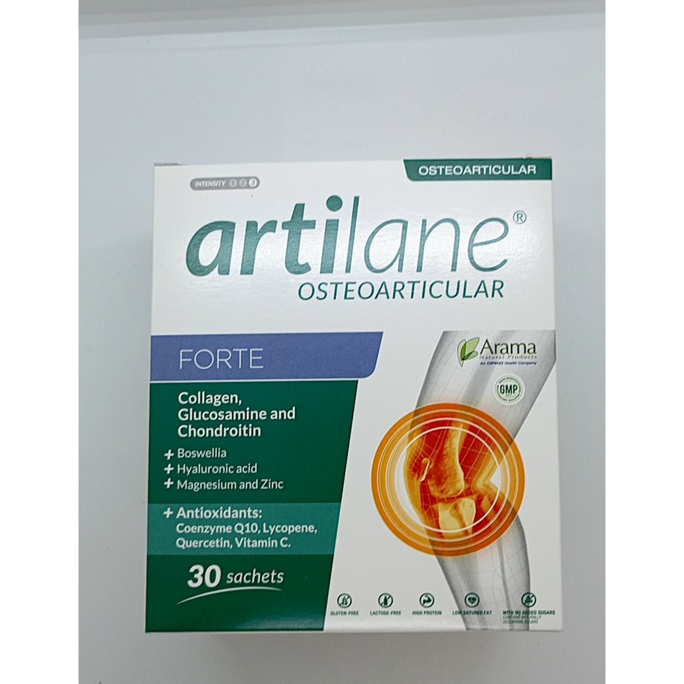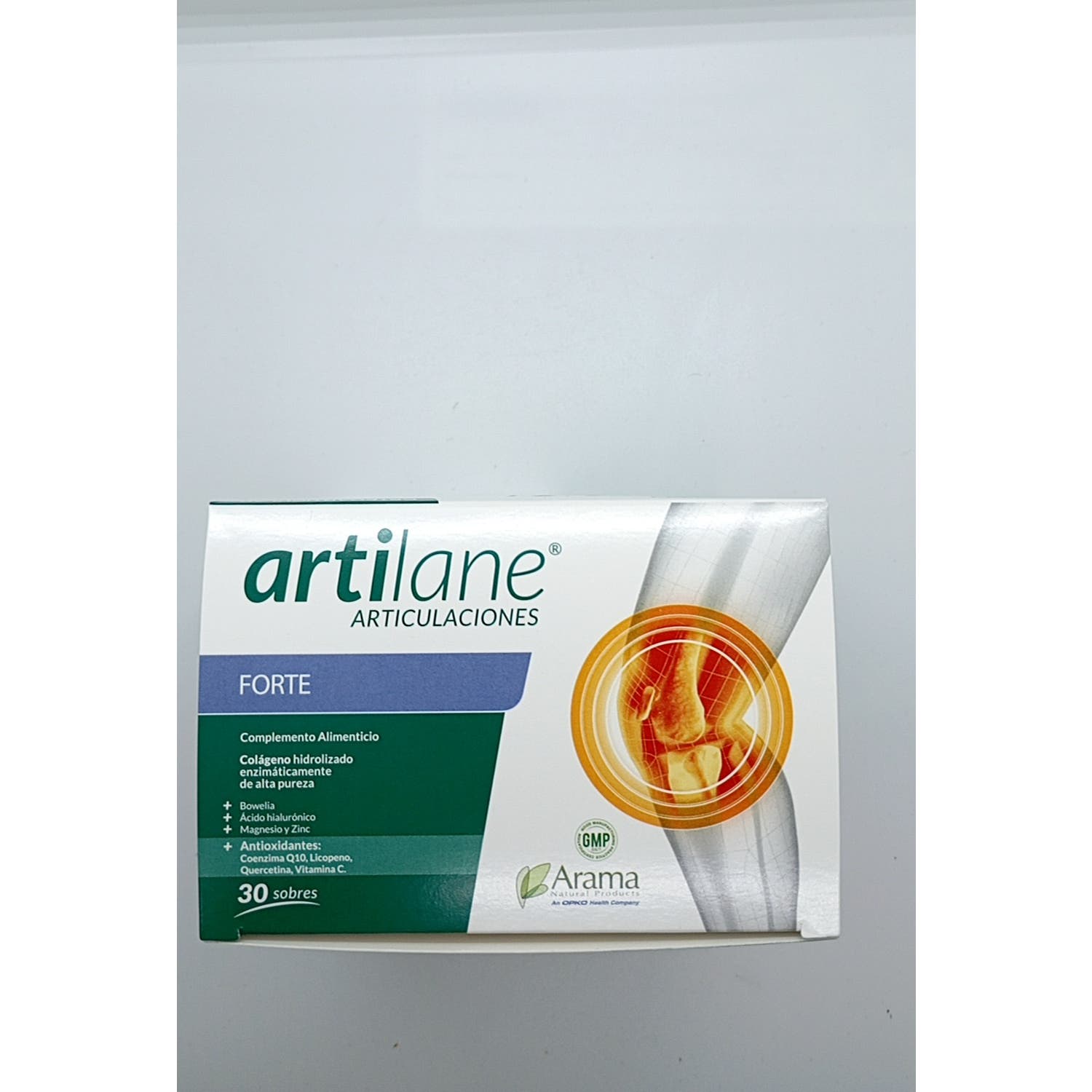 Arama Artilane Forte 30 Sobres es un complemento alimenticio indicado para el mantenimiento de las articulaciones, músculos y huesos. El producto contiene extracto de oleorresina de Boswelia y altas dosis de Glucosamina y Condroitina. Además, contiene Ácido hialurónico, Magnesio, Zinc, Boswelia y antioxidantes como la Coenzima Q10, Licopeno, Quercitina y Vitamina C.