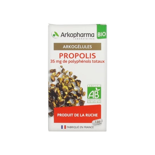Arkopharma Arkogélules Propolis Bio 130 Gélules es un complemento alimenticio con una fórmula altamente concentrada que contiene ingredientes activos específicos para ayudar a reforzar la inmunidad. Arkogélules® BIO Própolis aporta 35 mg de polifenoles totales al día.A partir de los 6 años de edad.100% vegetal, vegano ecológico, sin pesticidas químicos de síntesis, OGM, colorantes ni aditivos químicos.Fabricado en Francia.Los complementos alimenticios deben utilizarse como parte de un estilo de vida saludable y no como sustituto de una dieta variada y equilibrada.
