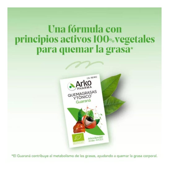 Arkopharma Arkocápsulas Guaraná BIO 40caps es un complemento alimenticio natural y ecológico, a base de Guaraná, que aporta energía, a la vez que contribuye a metabolizar y quemar la grasa corporal, por lo que favorece la pérdida de peso.