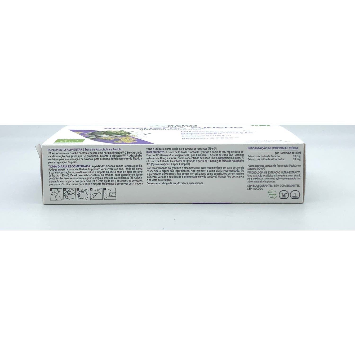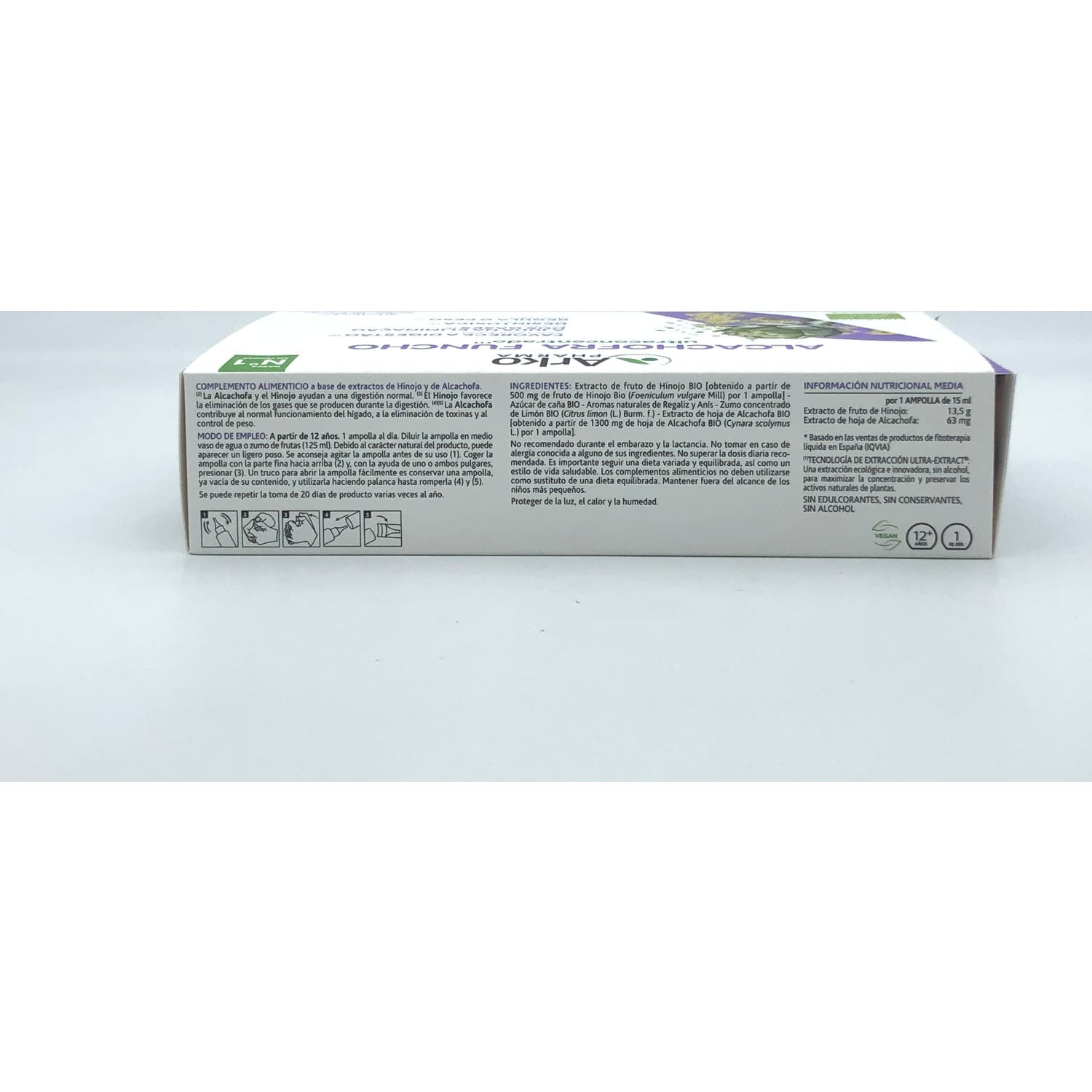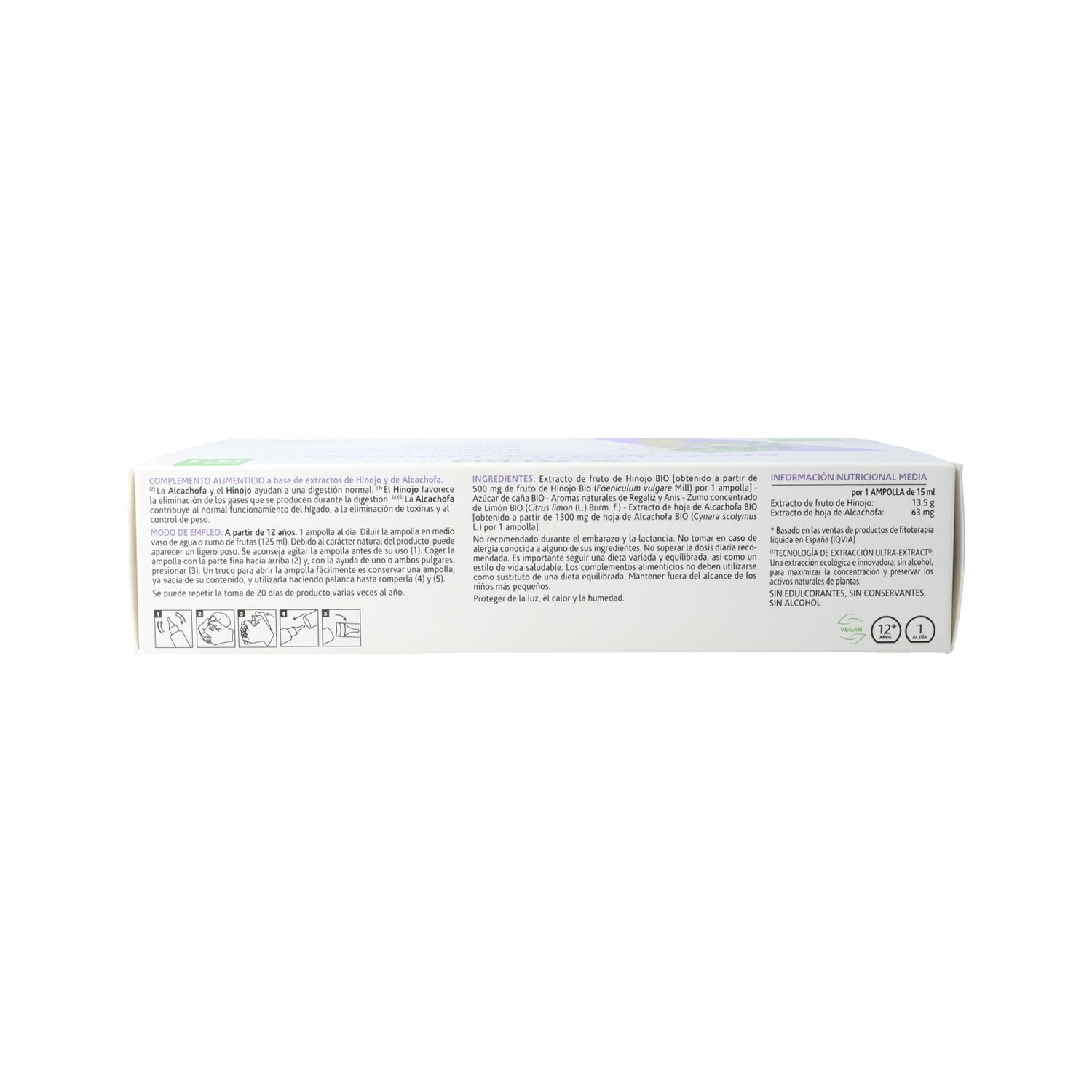 Dar la vuelta a la ampolla y colocar el primer extremo sobre el vaso. Ayudándose con un papel absorbente, romper el otro extremo fuera del vaso. Dejar que se vierta el líquido. Añadir el equivalente a medio vaso de agua o de zumo de frutas (125 ml). *Los complementos alimenticios deben tomarse dentro de una dieta variada y equilibrada y como parte de un estilo de vida activo.