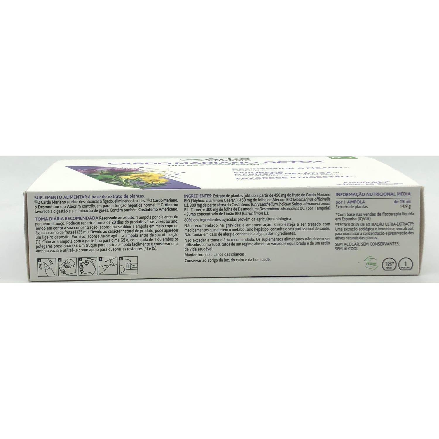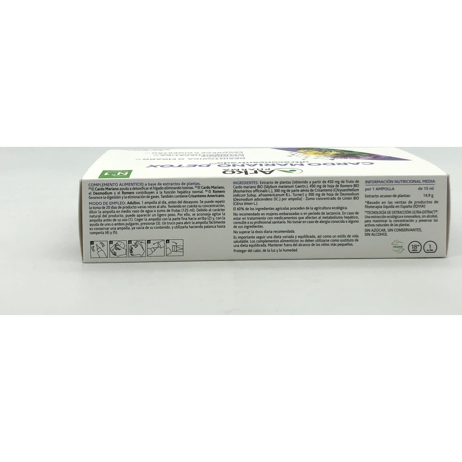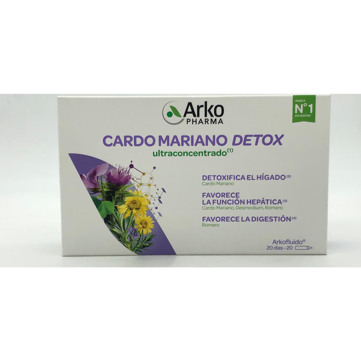 Arkopharma Arkofluido Cardo Mariano Detox 20 ampollas ayuda a detoxificar el cuerpo, principalmente el hígado, que sintetiza las grasas, carbohidratos, lípidos y proteínas. El cardo mariano es una planta que se utiliza para filtrar las toxinas del cuerpo y su fruto contiene tres activos: silibina, silcristina y silidianina, que forman un complejo hepatoprotector, actuando directamente sobre las células del hígado, regenerándolas y combatiendo las sustancias hepatotóxicas.