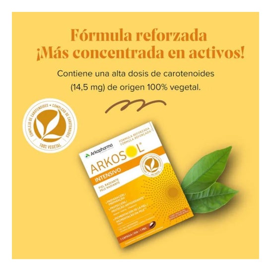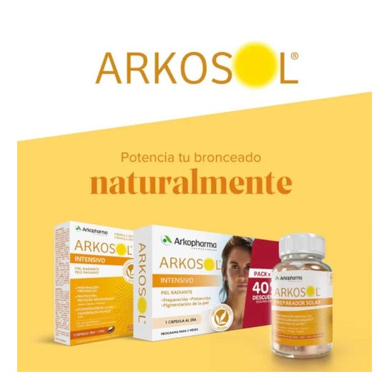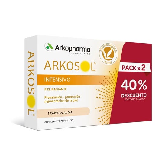 Arkopharma Arkosol Intensivo 2x30caps es un complemento alimenticio que ayuda a reforzar y acelerar el bronceado.