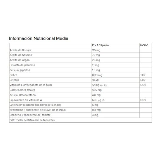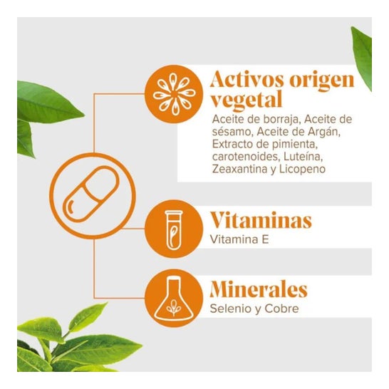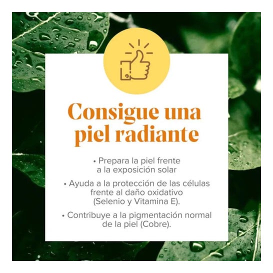 Elaborado a base selenio, que minimiza el daño oxidativo de las células por la exposición a los rayos solares y cobre, que prolonga el bronceado en la piel. Además, de extracto de aceite de argán, que permite que la dermis mantenga su elasticidad y firmeza, y aceite de borraja, que disminuye la perdida de hidratación de la piel y aporta un extra de luminosidad al bronceado. La vitamina E que ayuda a retrasar los signos del envejecimiento y crea una barrera protectora contra la contaminación y los radicales libres.