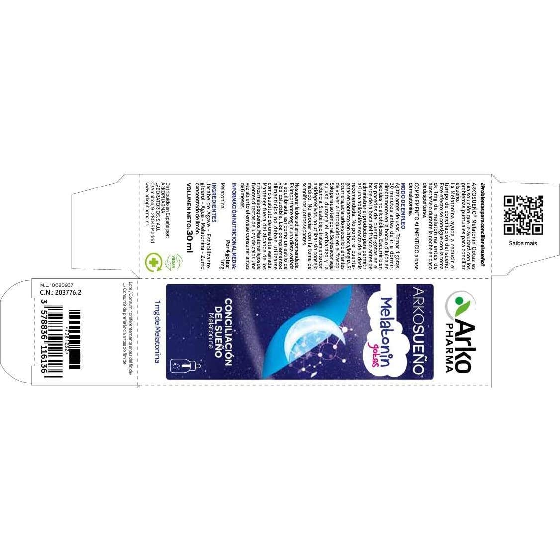 Arkopharma Arkosueño Melatonin Gotas 30ml es un complemento alimenticio vegano en formato líquido que ayuda a conciliar el sueño y a mejorar la calidad del descanso, actuando de manera rápida.
