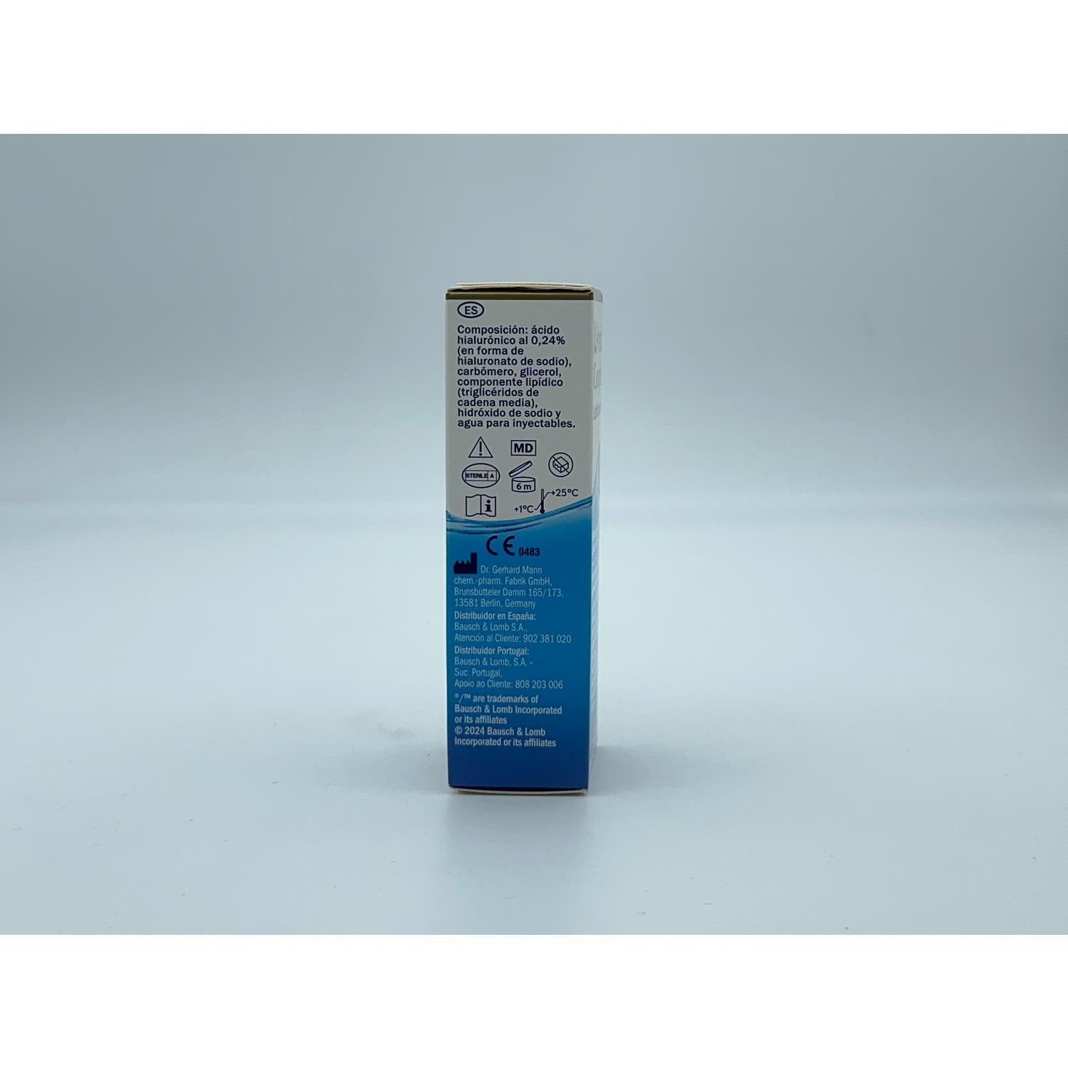 Elaborado a base de ácido hialurónico (en forma de hialuronato sódico) que actúa como humectante natural para el ojo y la película lagrimal y contribuye al mantenimiento de las tres capas de la película lagrimal. Además, contiene carbómero y glicerol como humectantes adicionales. Diseñado para permanecer en la superficie ocular e imitando la película lagrimal natural.