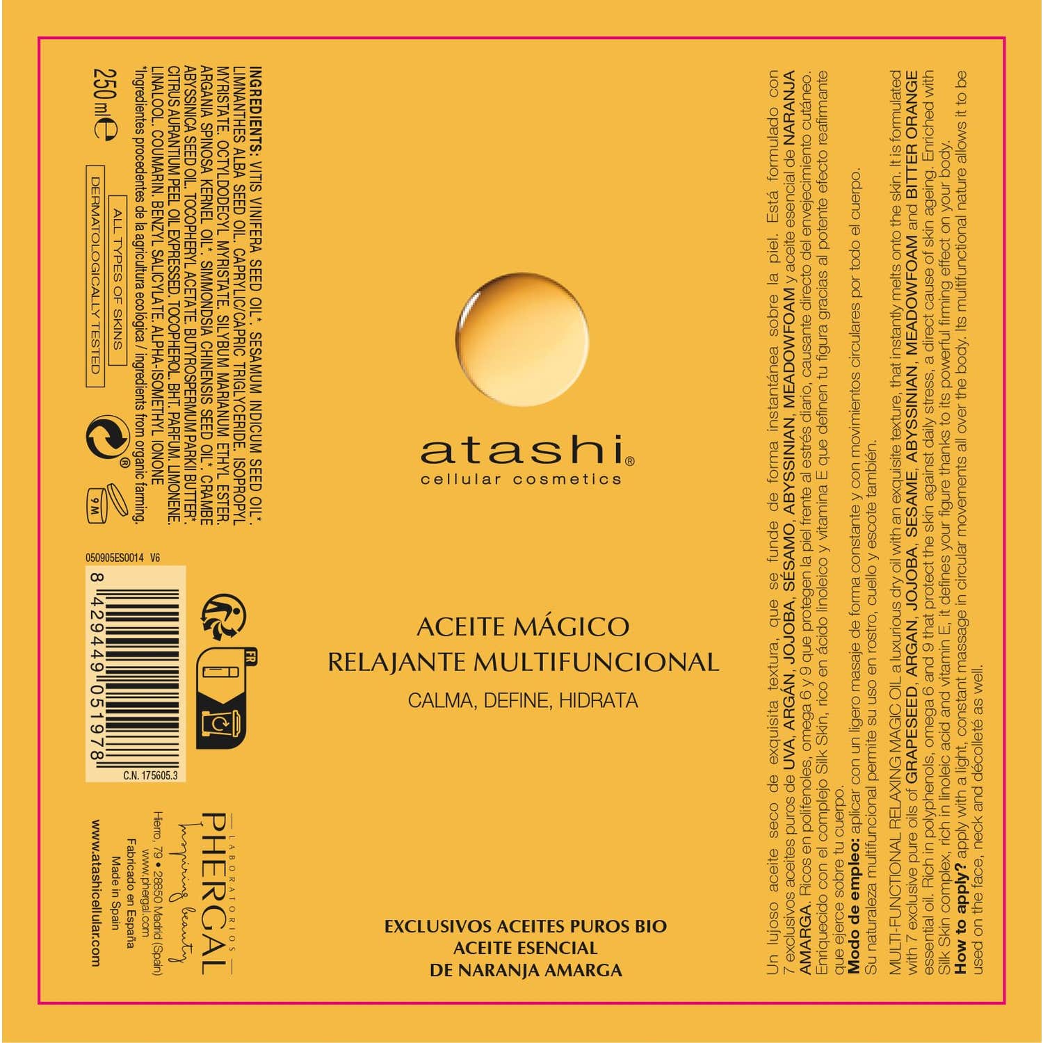 Atashi® Cellular Cosmetics aceite mágico antiedad 250ml es un aceite cosmético que ayuda a nutrir, hidratar y calmar la piel del cuerpo, brindando una sensación de relax. Contiene 7 aceites puros: sésamo, argán, uva, jojoba, abyssinian, meadowfoam y naranja amarga, 100% orgánicos. Como producto, este aceite es un ritual de belleza indicado para recuperar la suavidad a la piel del cuerpo. Indicado para todo tipo de pieles, incluso para pieles sensibles o atópicas, ya que permite una hidratación óptima sin provocar ninguna irritación.