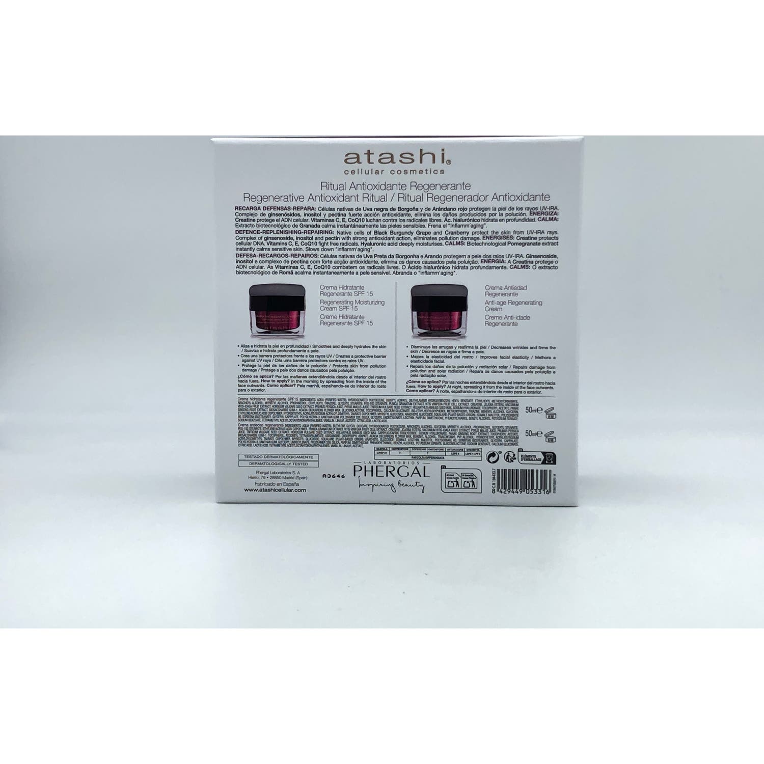 En primer lugar, la Crema Hidratante Regenerante Antioxidante SPF15 Atashi 50ml es un tratamiento antioxidante concentrado con una alta cantidad de polifenoles provenientes de células madre vegetales de uva negra de Borgoña y arándano rojo, junto con extracto biotecnológico de granada. Este escudo protector ayuda a detener el envejecimiento cutáneo causado por los radicales libres, la radiación solar y la contaminación. Proporciona hidratación, suavidad, elasticidad y luminosidad a la piel, al tiempo que fortalece las células madre epidérmicas para prevenir la pérdida de colágeno y elastina. Contiene creatina para proteger el ADN celular, vitaminas C, E y Q10 para activar el metabolismo celular, extracto de granada para reducir la inflamación crónica y calmar pieles sensibles, ácido hialurónico para hidratar y redensificar, así como extracto biotecnológico de granada para aliviar incomodidades en pieles sensibles.
