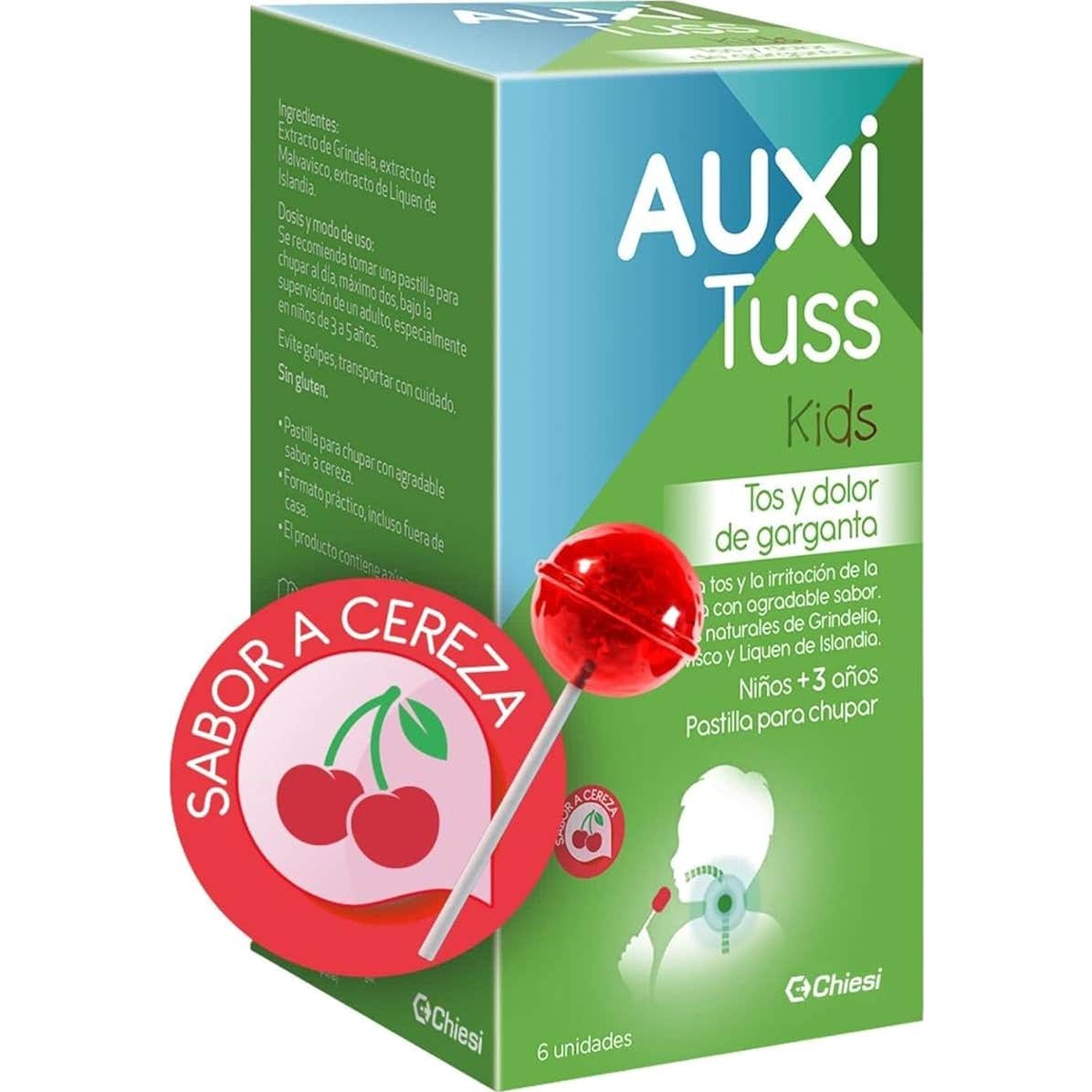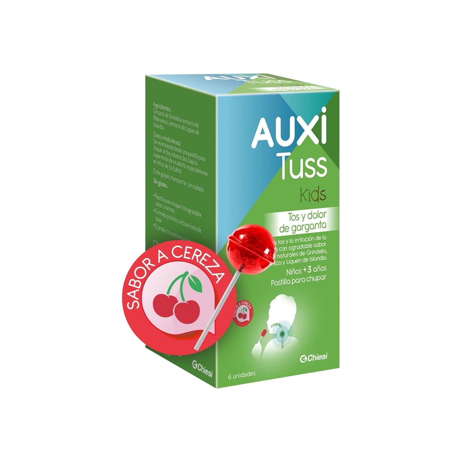 AuxiTuss Kids Pastillas para Chupar 6uds es un complemento alimenticio en práctico formato de gominolas con forma de chupachups y agradable sabor a cereza, diseñado para favorecer el alivio de las vías respiratorias superiores. Contribuye a aliviar molestias e irritaciones en la zona de la garganta y nariz, mientras promueve el adecuado funcionamiento del sistema inmune.
