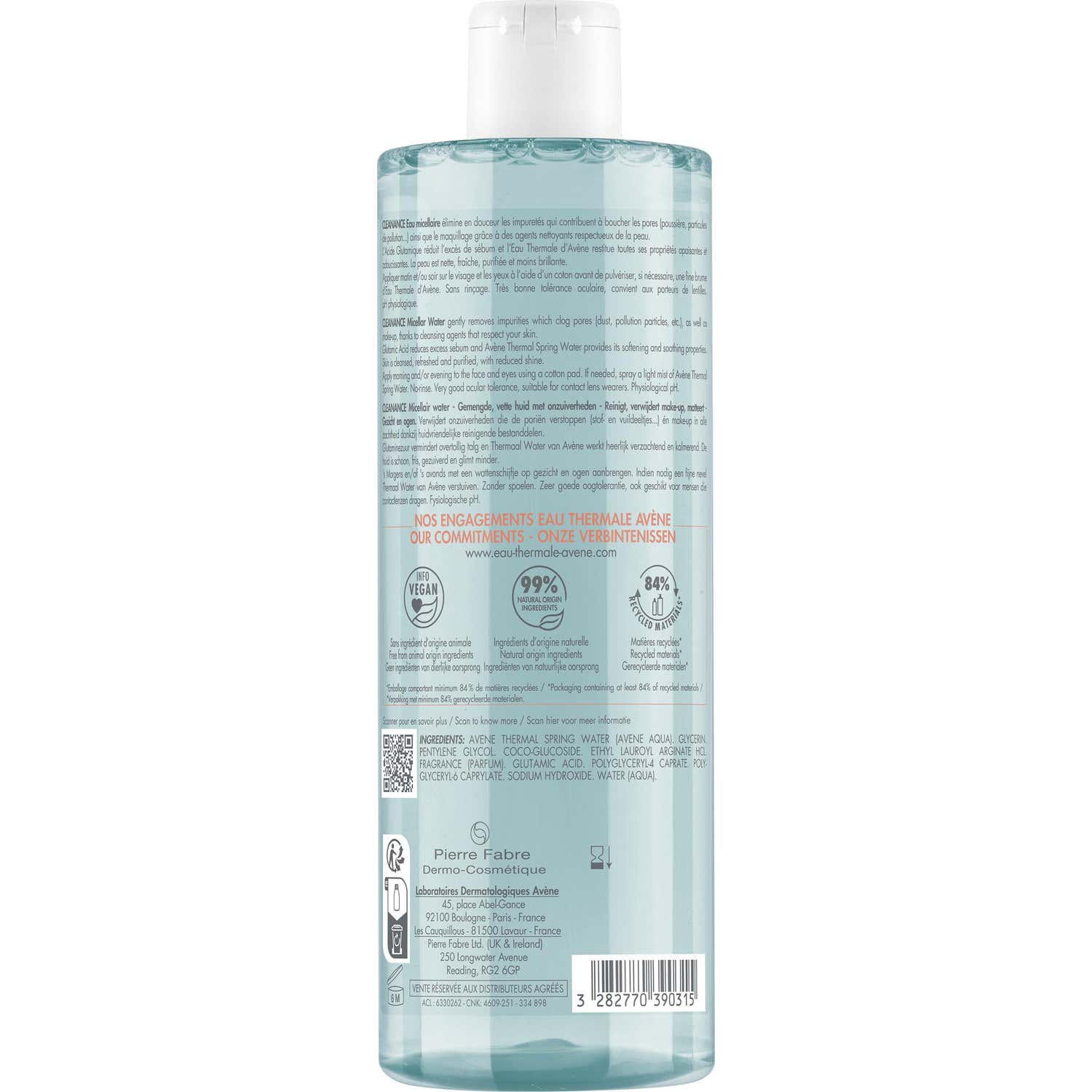 Agua micelar elaborada con agua termal de Avène, de propiedades calmantes y antiirritantes, que es apta para el uso diario en rostro y ojos.