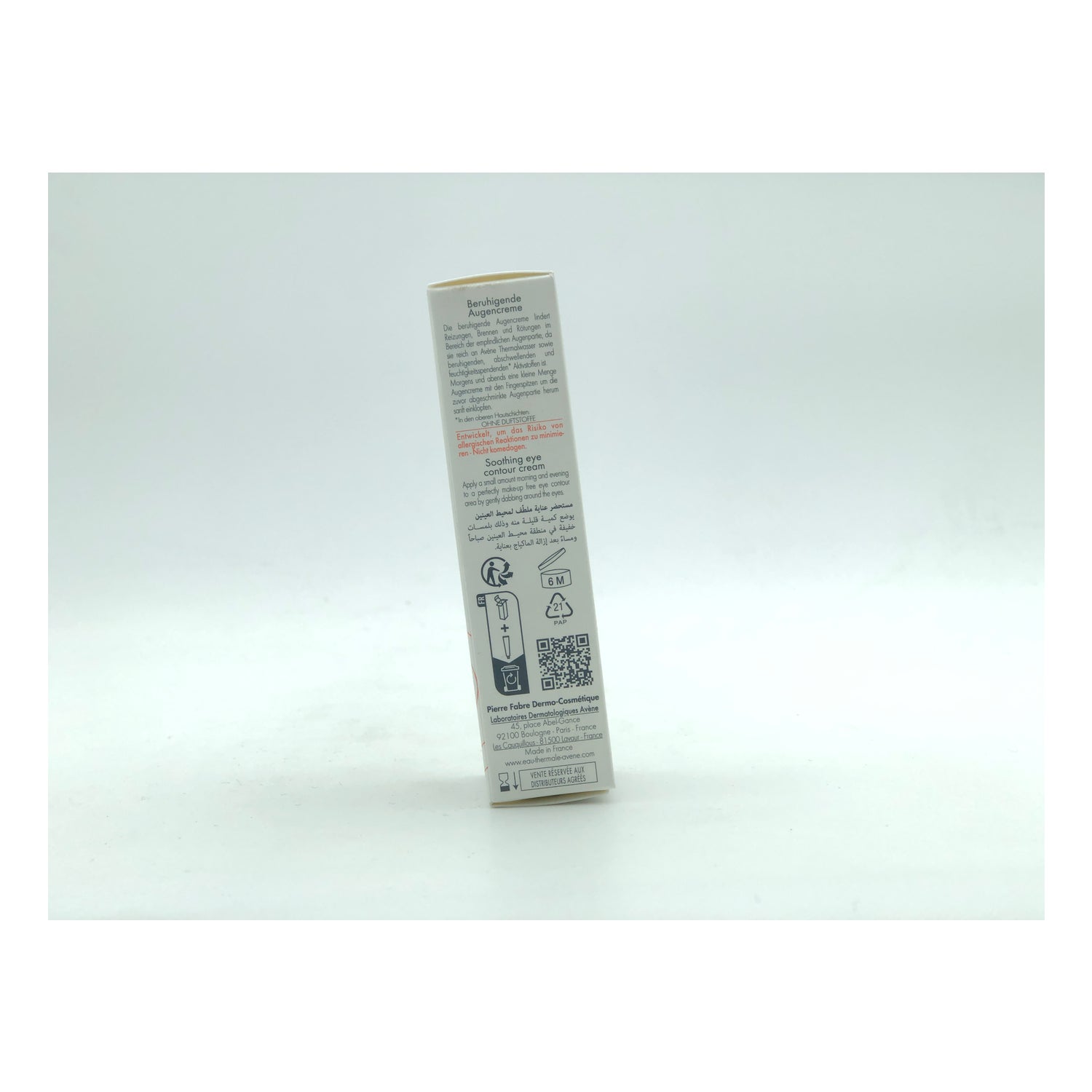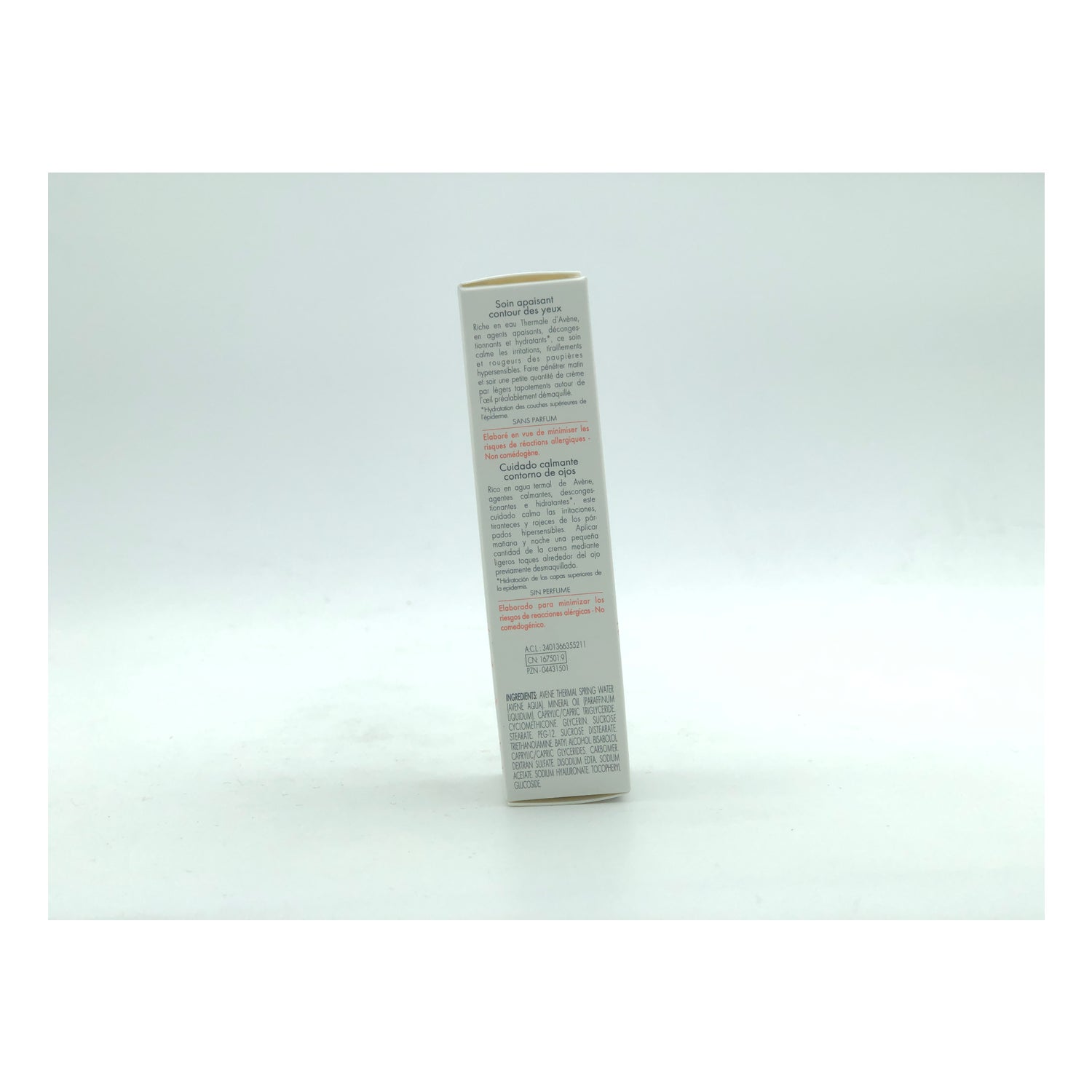Por su alto contenido en Agua termal de Avène genera un efecto calmante que disminuye las irritaciones, la tirantez y las rojeces que se producen alrededor de los ojos.