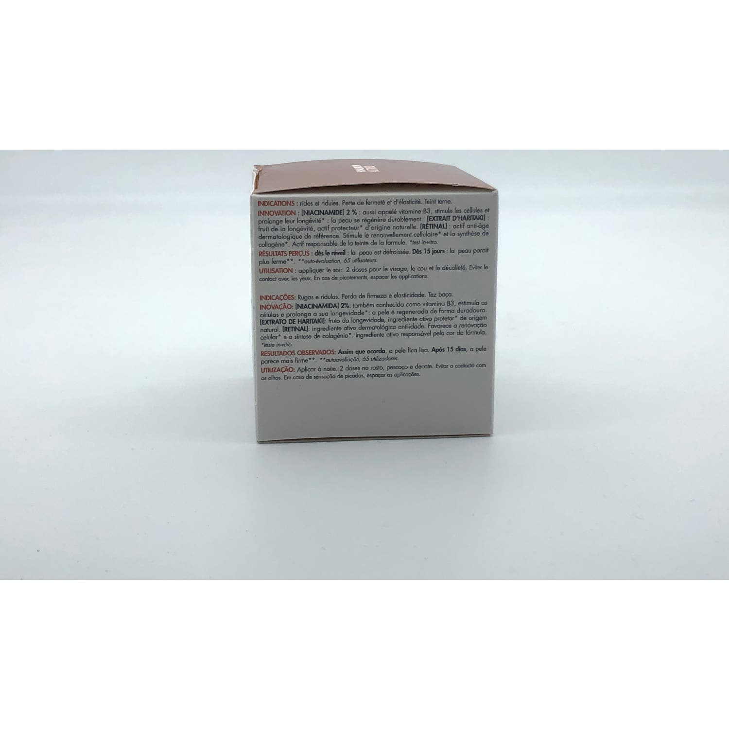 Contiene ácido hialurónico puro y niacinamida, que actúan sobre las causas del envejecimiento de la dermis para ayudar a que la piel luzca más firme y las arrugas se reduzcan.