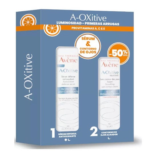 Avène Pack A-Oxitive es un set de cuidado facial que contiene el Avène A-oxitive Sérum de 30ml y el contorno de ojos Eau Thermale Avène A-oxitive de 15ml. Ambos productos están enriquecidos con el agua termal de Avène que contribuye a calmar y a aliviar la irritación de la piel. Por su parte el sérum contribuye a reducir las irregularidades del tono de la piel, como manchas hiperpigmentarias, gracias a su formulación con retinaldehído y provitamina A. Asimismo, presenta un alto contenido en provitamina E, elemento de gran poder antioxidante que ayuda a proteger la piel del estrés oxidativo causante del envejecimiento prematuro de la piel. Por otro lado, el contorno de ojos contribuye a restaurar la barrera hidrolipídica de la piel y ayuda a aportar suavidad a la zona del contorno de ojos.