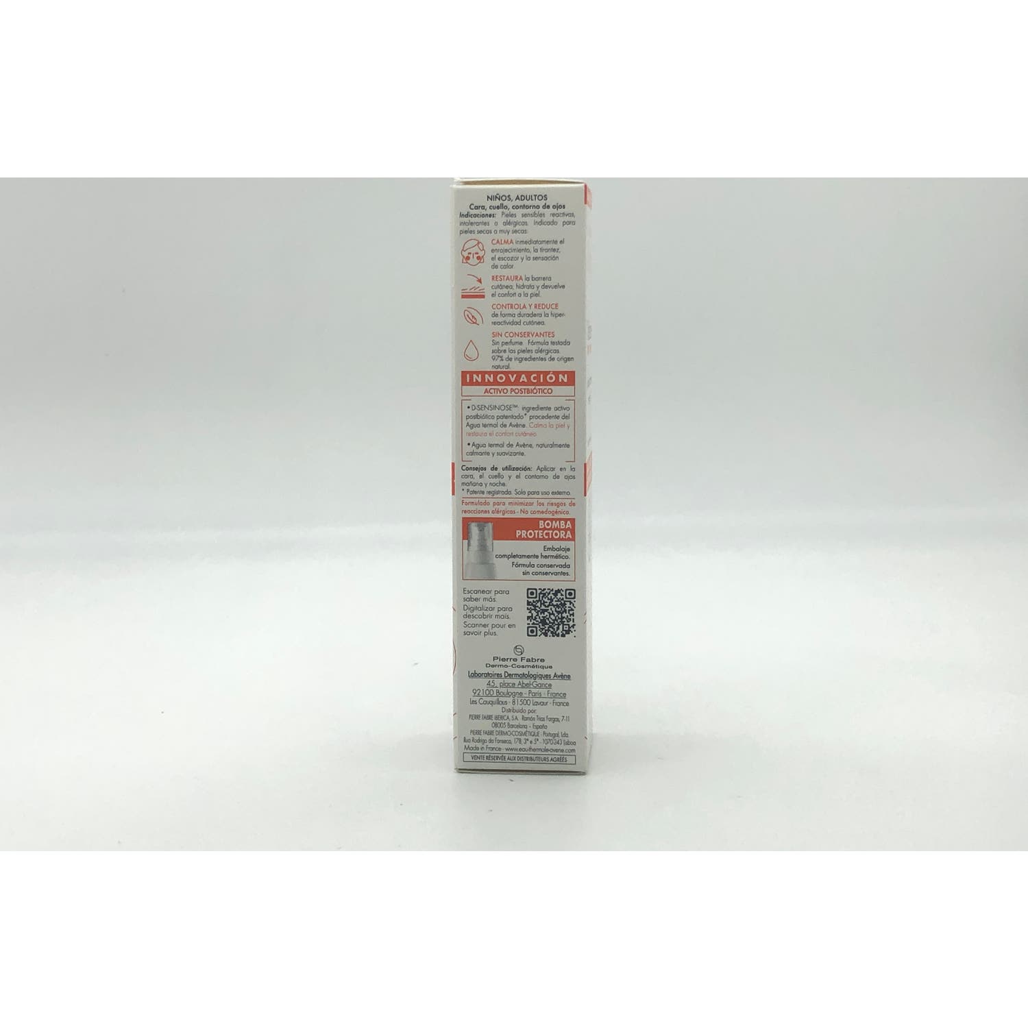 Su fórmula a base de D-Sensinose™: un activo postbiótico patentado ultra-calmante derivado del agua termal de Avène ofrece una triple acción: calma inmediatamente el enrojecimiento, la tirantez, el hormigueo y la sensación de calor, restaura la barrera cutánea, hidrata y devuelve el confort a la piel y controla y reduce de forma duradera la hiperreactividad de la piel.