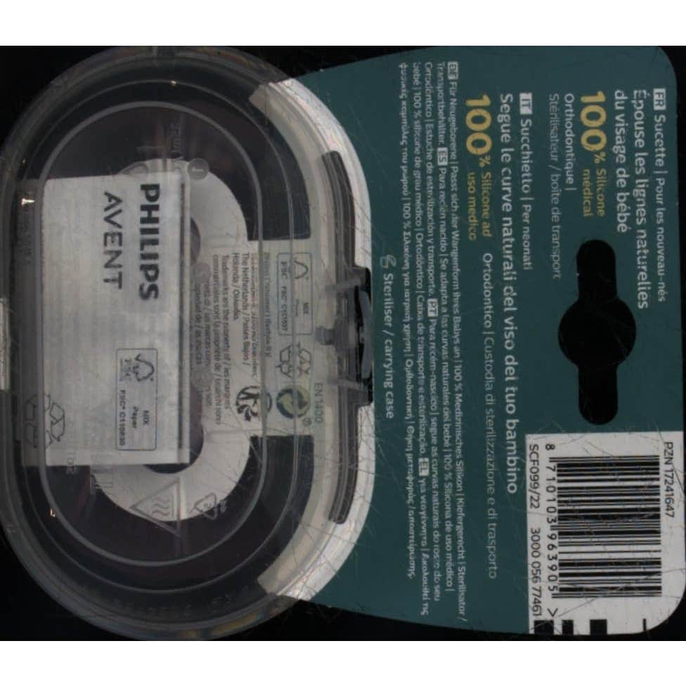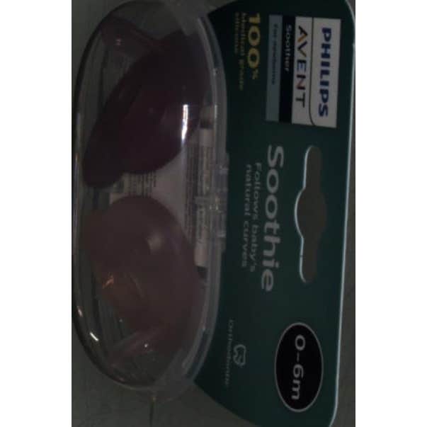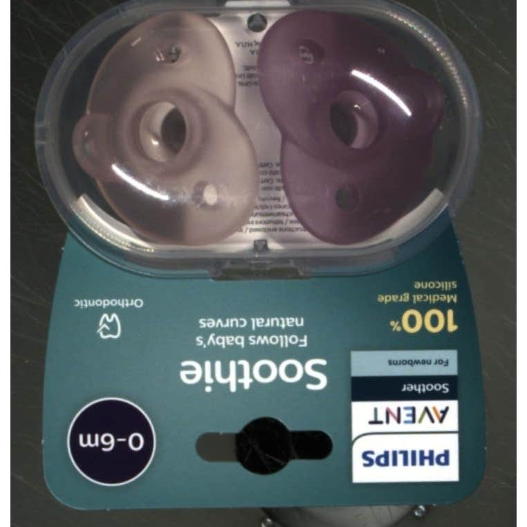 Chupete para recién nacidos y bebés de Avent, presentado en envase de 2 unidades. Diseño desarrollado en función de los contornos faciales naturales del bebé.