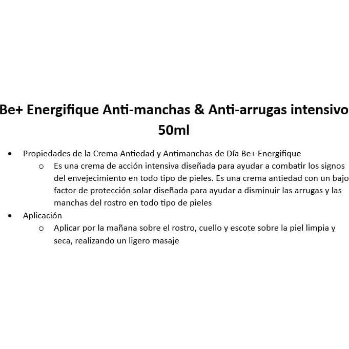 Be+ Energifique Anti-Manchas Anti-Arrugas Crema Inten Spf20 50ml es una crema antienvejecimiento de la marca Be+ de Cinfa, formulada para combatir las manchas y arrugas del rostro. Esta crema de acción intensiva está diseñada para ser efectiva en todo tipo de pieles.