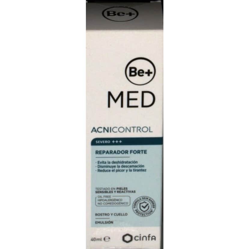 Be+ Med Acnicontrol Reparador Forte 40ml es una crema de efecto reparador que contribuye a hidratar y calmar la piel agredida por tratamientos antiacneicos.