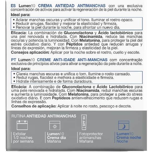 La crema de noche Lumen10 potencia la reparación nocturna de tu piel gracias a su innovador complejo con melatonina, que protege contra el estrés oxidativo. Contiene gluconolactona y ácido lactobiónico para una exfoliación suave e hidratación profunda, mientras que la niacinamida ilumina y mejora el tono. Los péptidos antiedad reafirman y reducen arrugas. Su textura gel-crema y fragancia floral envolvente garantizan una experiencia de bienestar antes de dormir. Despierta con una piel uniforme, luminosa y rejuvenecida.