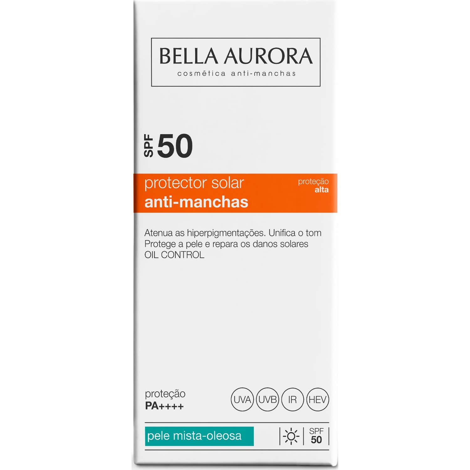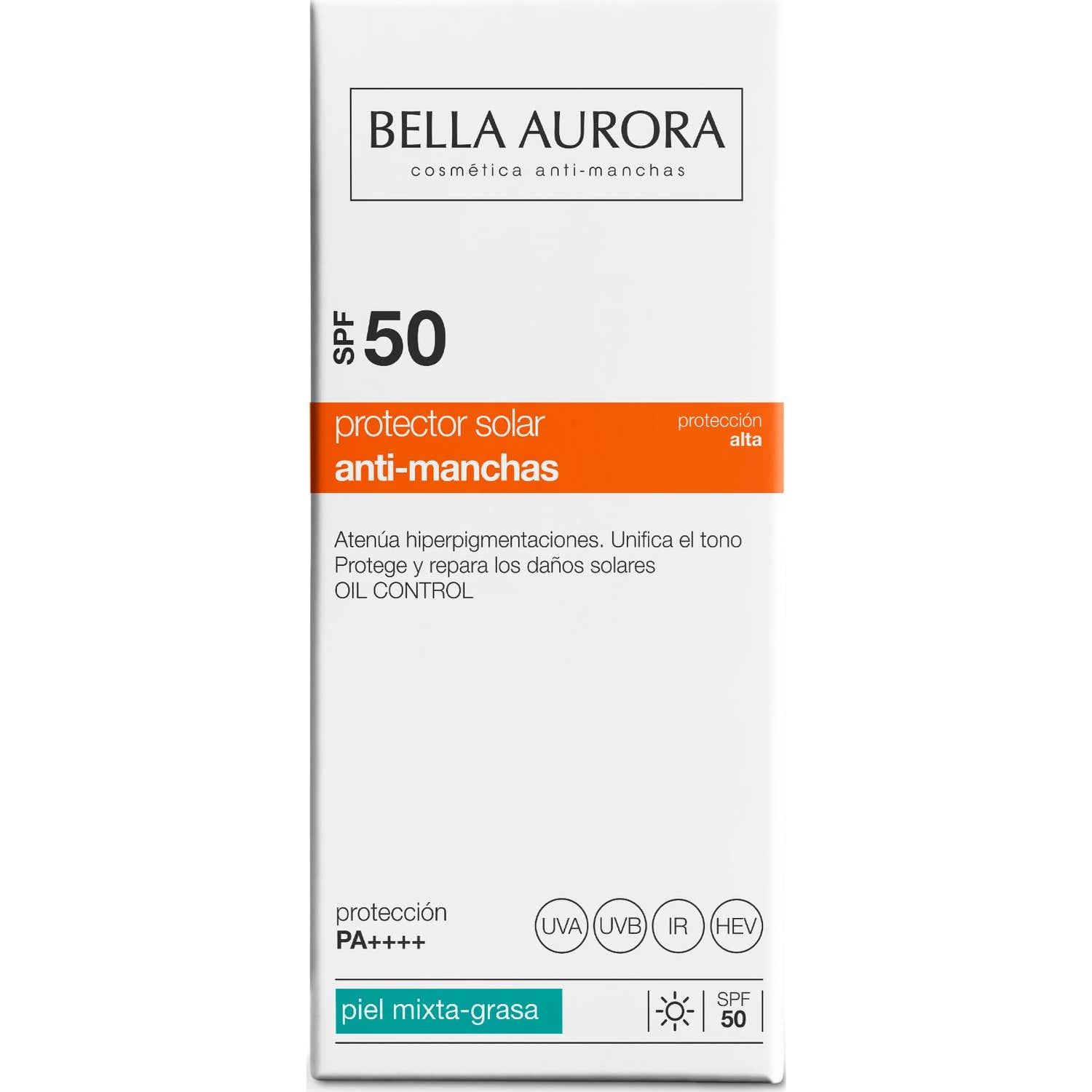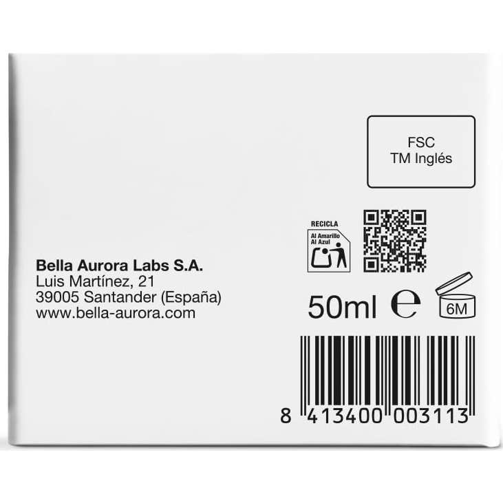 Bella Aurora Protector Solar Facial Anti-Manchas Piel Mixta-Grasa SPF50+ 50ml es un solar de protección alta con filtros espectro UVA, UVB e IR, microencapsulados en un sistema de doble esfera, que contribuye a aportar una alta protección para la piel.