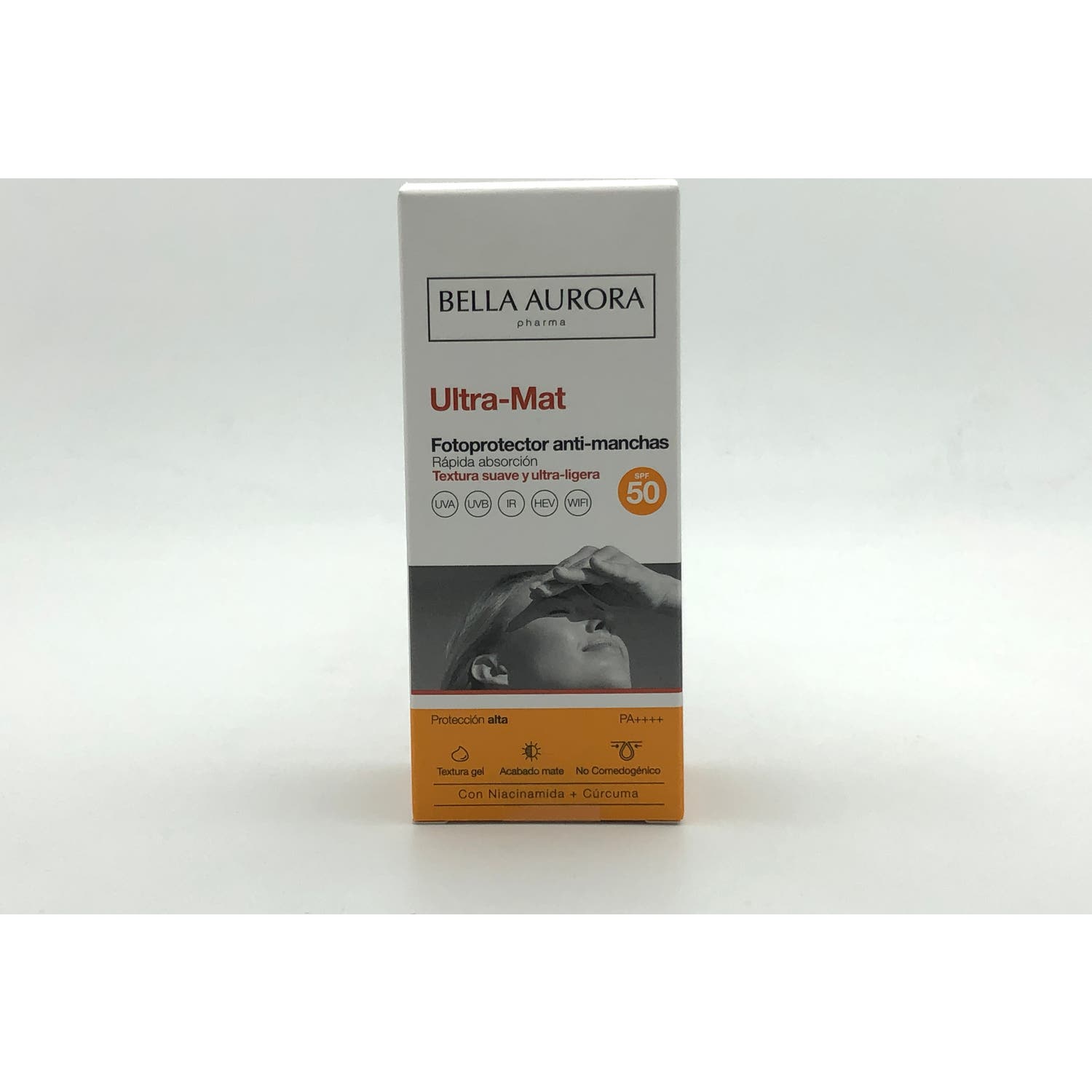 Bella Aurora Ultra-Mat Protector Solar Facial Anti-Manchas SPF50 Piel Grasa 50ml es un fotoprotector solar facial que contribuye a proteger la piel del rostro de la acción de los rayos solares.