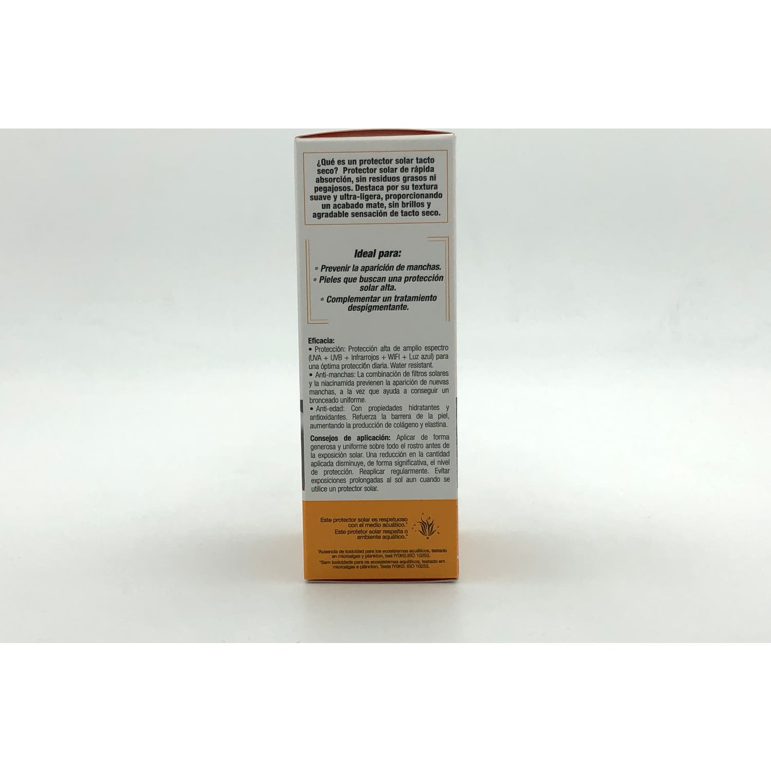 Ofrece una protección alta de amplio espectro SPF50 frente a UVA, UVB, IR y HEV.