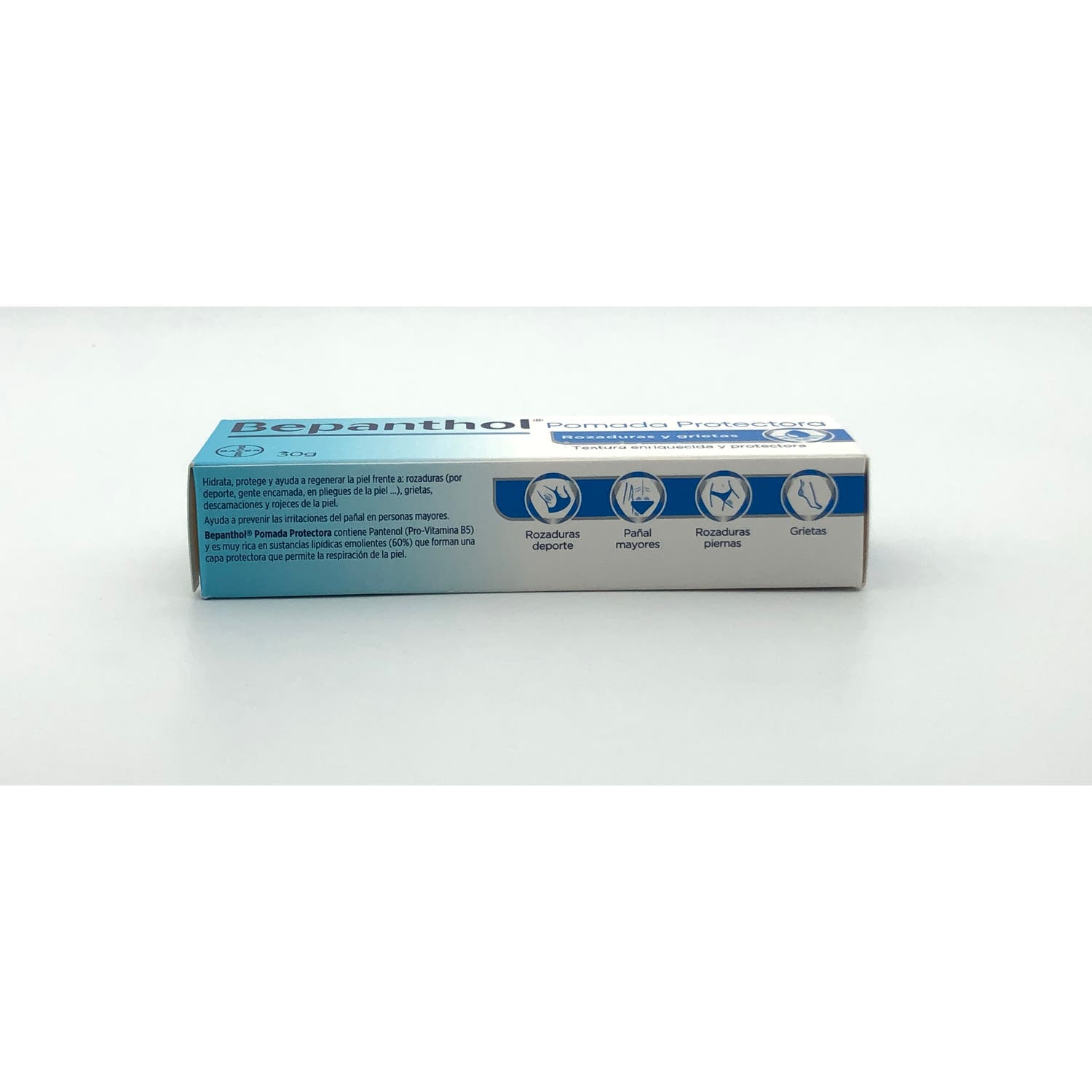 Bepanthol Pomada Protectora 30g es una emulsión oleosa hidratante que favorece la regeneración natural de la piel seca, sensible, agrietada y fácilmente irritable. Su fórmula tiene un alto contenido lipídico y en dexpantenol, que forma una capa protectora sobre la superficie de la piel, aislándola de los agentes externos que la irritan.
