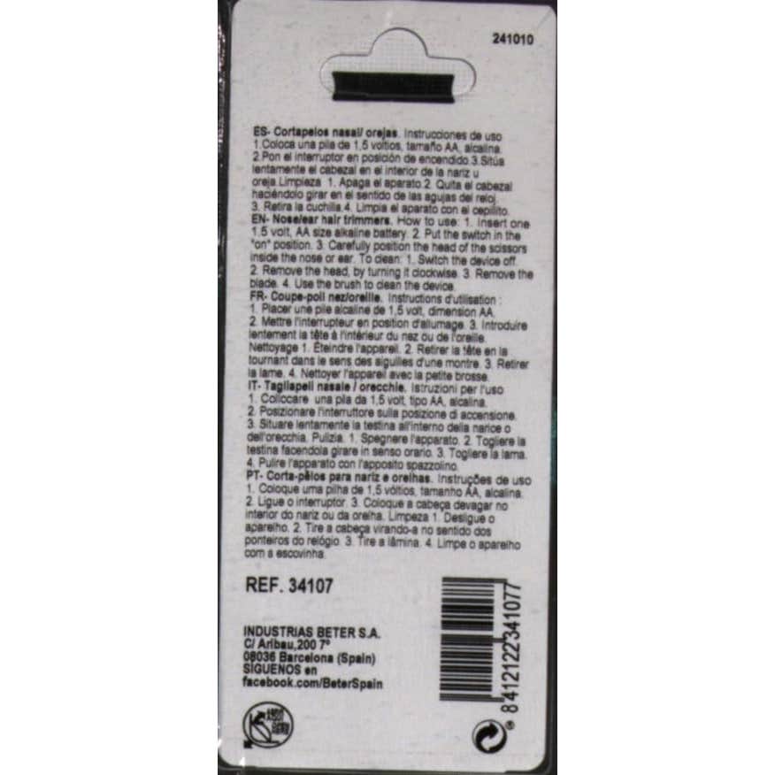 Beter maquinilla cortapelos nariz y orejas se trata de una sencilla maquinilla para eliminar rápidamente los incómodos pelitos de la nariz y las orejas. Es un método muy seguro y eficaz para retirar los pelos de estas partes del cuerpo. Funciona con una pila AA de 1,5 voltios.