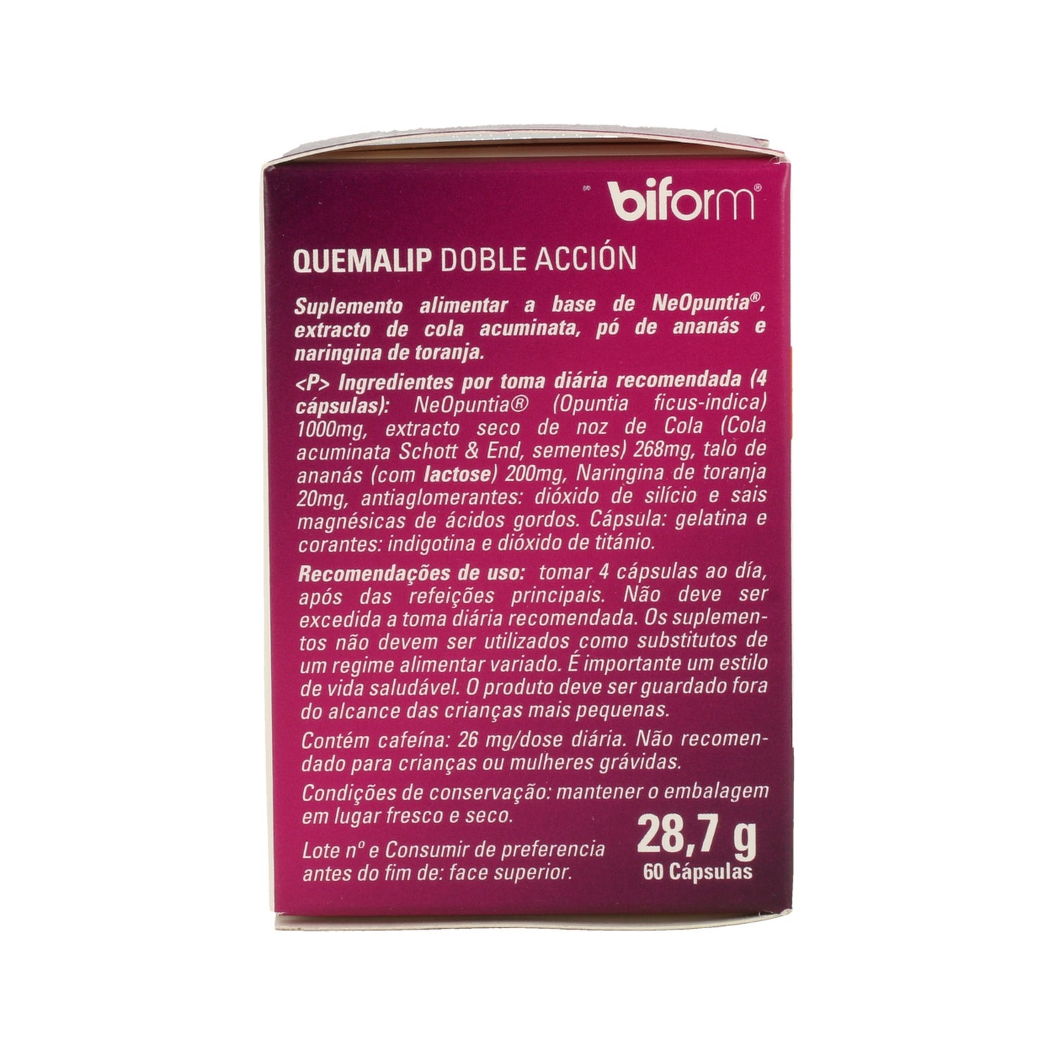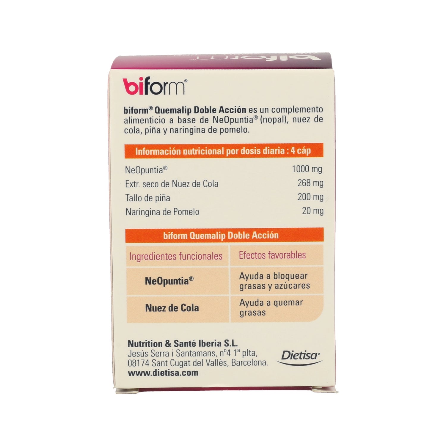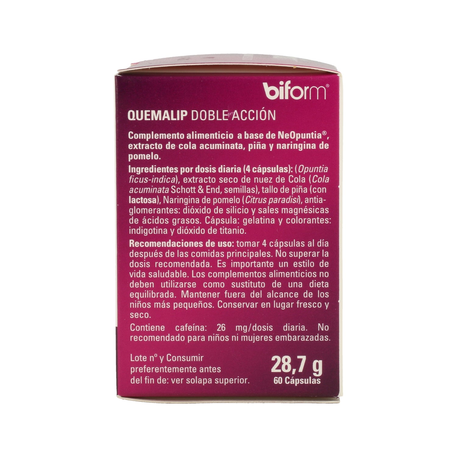 Biform Quemalip Doble Acción 60caps es un complemento alimenticio para dietas de adelgazamiento y control de peso.