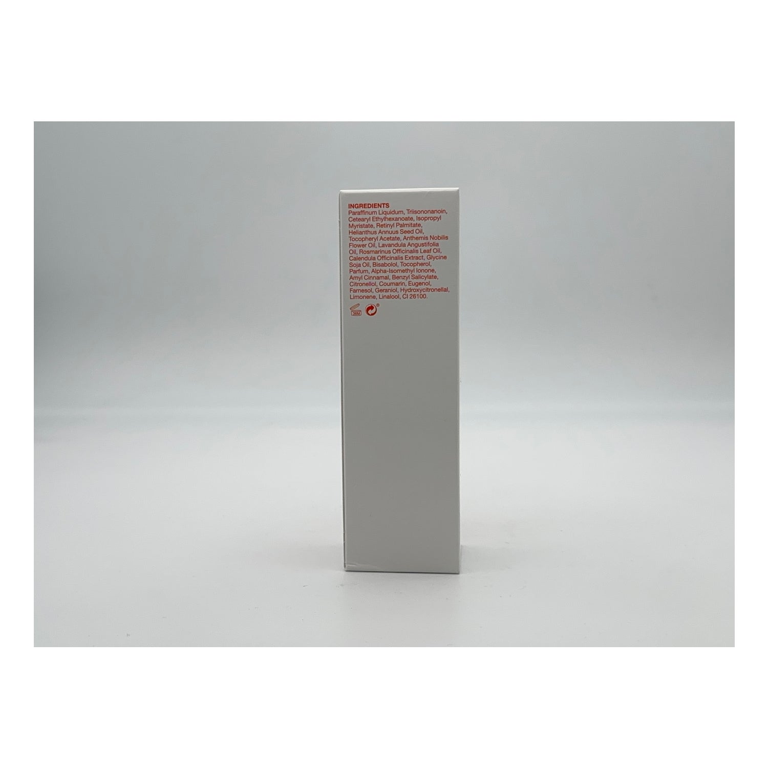 Paraffinum liquidum, triisononanoin, cetearyl ethylhexylhexanoate, isopropyl myristate, retinyl palmitate, heliantus annuus seed oil, tocopheryl acetate, anthemis nobilis flower oil, lavandula angustifolia oil, rosmarinus officinalis leaf oil, calendula officinalis extract, glycine soja oil, bisabolol, tocopherol, parfum, alpha-isomethyl ionone, amul cinnamal, benzyl salicylate, citronellol, coumarin, eugenol, farnesol, geraniol, hydroxycitronellal, limonene, linalool, CI 26100.