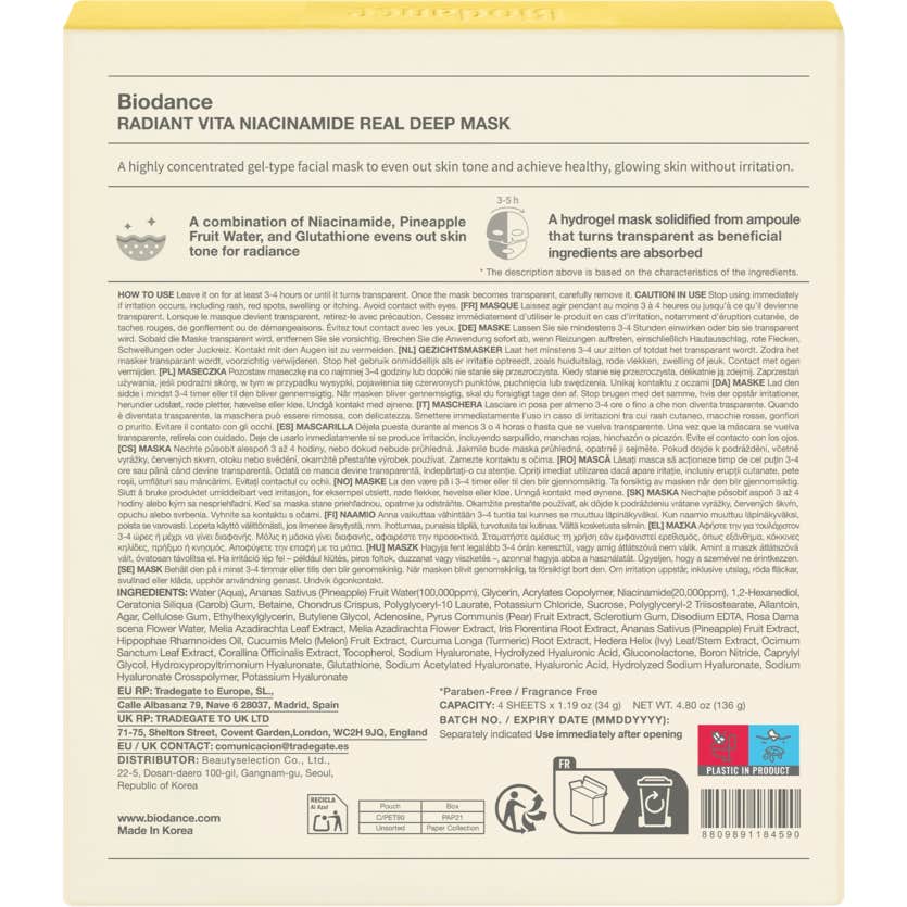 Biodance Radiant Vita Niacinamide Real Deep Mascarilla 4x34 gr es una mascarilla de hidrogel intensiva para mejorar el tono irregular y la apariencia de manchas oscuras y melasma. Combina niacinamida y glutatión de alta pureza para aportar luminosidad y unificar el aspecto de la piel en profundidad. Apta para uso diurno y nocturno.