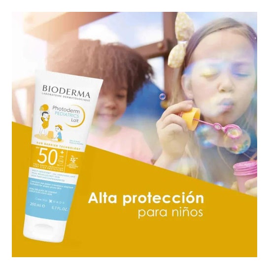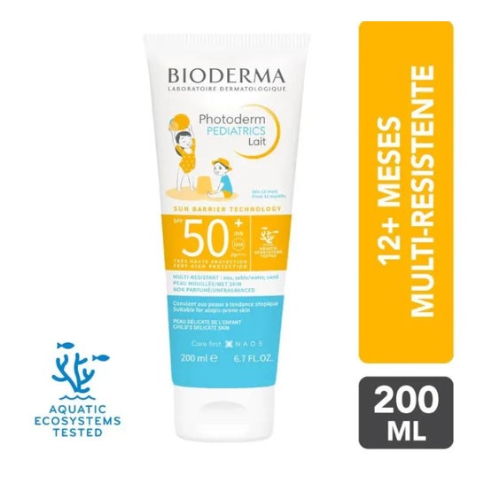 Bioderma Photoderm Pediatrics Lait SPF50+ 200ml es un protector solar infantil que aporta protección muy alta SPF50+ en formato leche corporal. Tiene una textura fácil de aplicar y que se absorbe rápidamente. Formulada con semillas de albaricoque y vitamina E.
