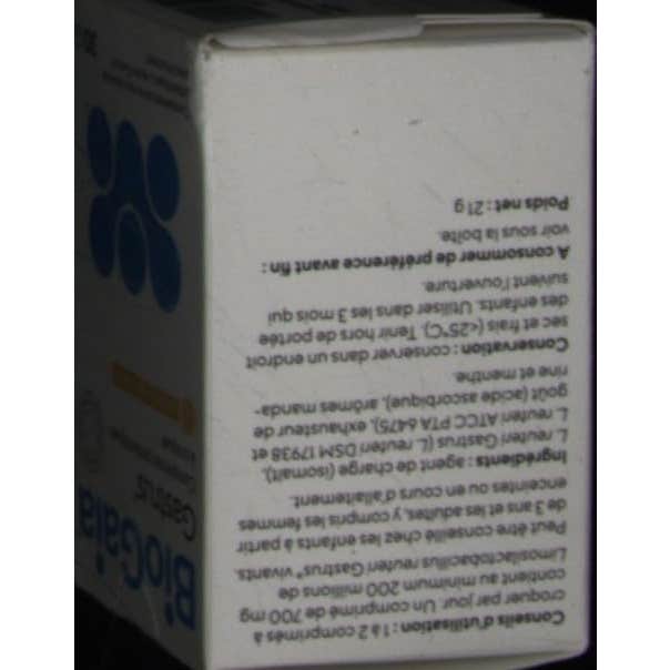 Ingredientes para 1 comprimido: Agente de carga: isomaltosa, Limosil actobacillus* reuteri Gastrus® (L. reuteri DSM 17938 y L. reuteri ATCC PTA 6475) dosificado a 2,10⁸ UFC* por día, potenciador del sabor: ácido ascórbico, aroma mandarina y aroma a menta. Una tableta contiene al menos 100 millones de bacterias vivas L. reuteri Gastrus® .